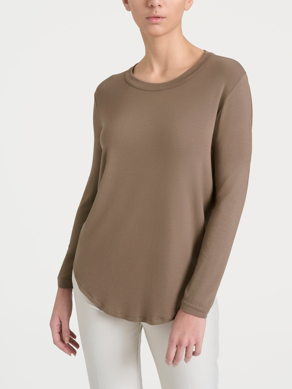 Es ideal combinada con los pantalones Ragno, con los que se puede crear un estilo informal, elegante o más sofisticado, según la personalidad de quien la lleve. Perfecta para las temporadas de entretiempo, cuando se necesita una capa adicional ligera de manga larga, o en las temporadas más frías como capa base.