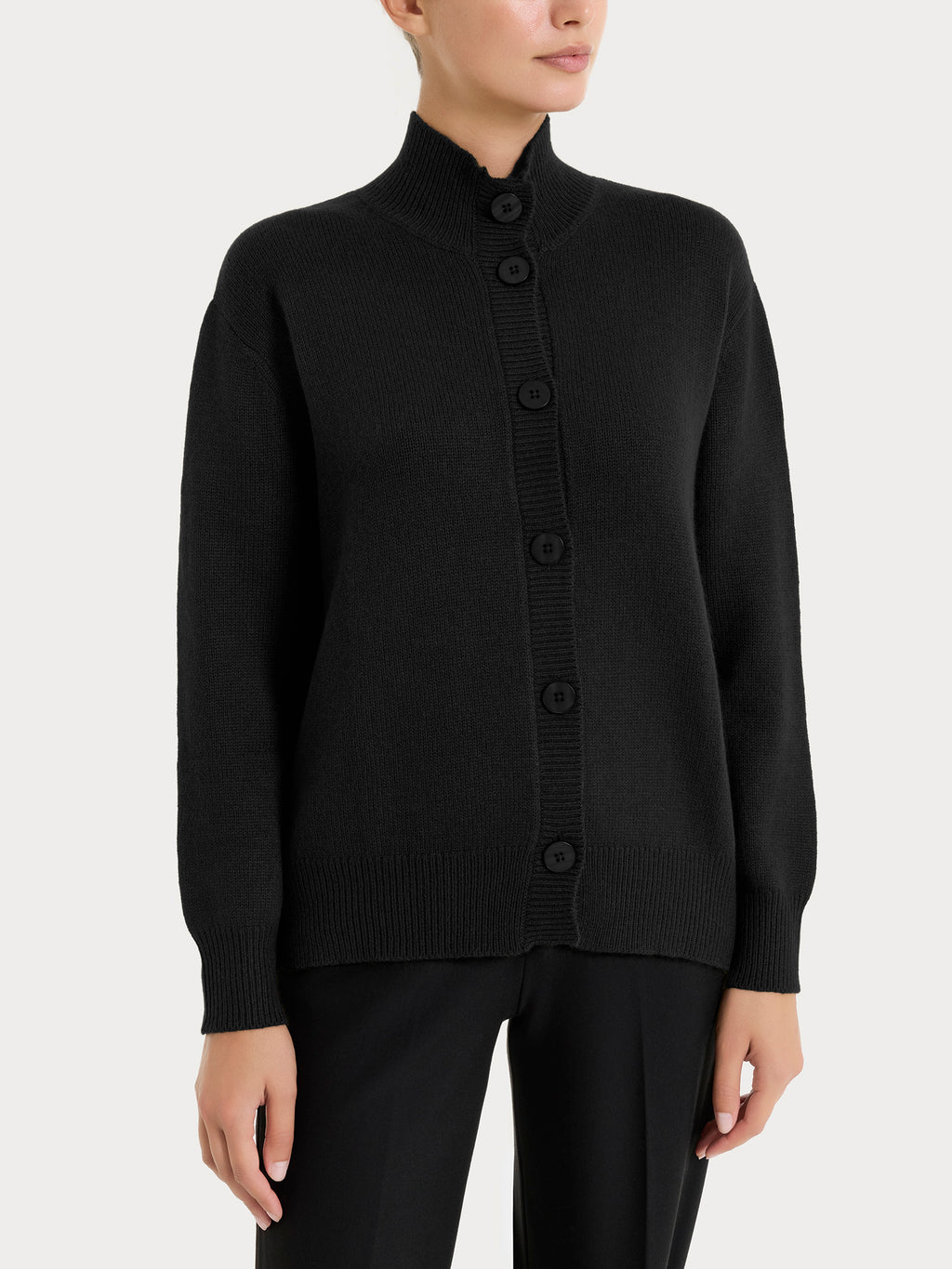 Cárdigan corto de mujer con cierre de botones, cuello alto y mangas largas.