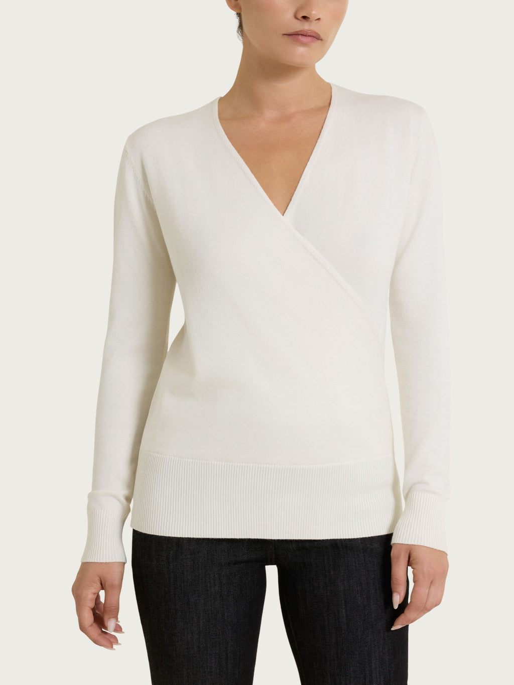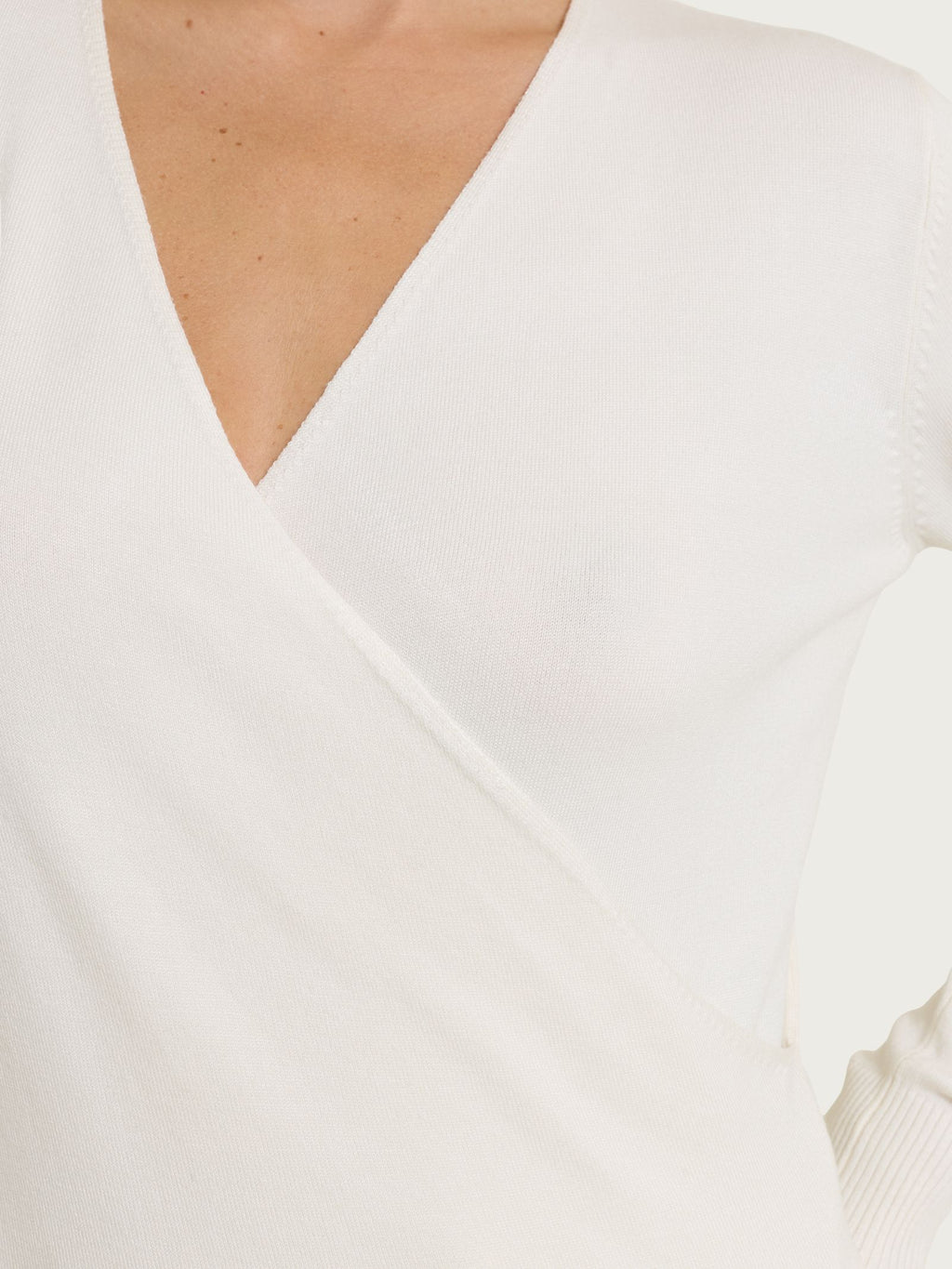Modelo envolvente en punto rasado, cómodo, adecuado para todas las estaciones. El diseño cruzado en la parte delantera realza la silueta de forma natural, creando un delicado efecto de cuello en V que estiliza la figura y aporta equilibrio al look.