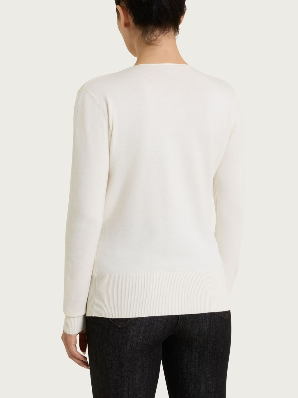 Jersey de mujer con cuello de pico confeccionado en mezcla de viscosa, tejido en galga 12, cálido y confortable.