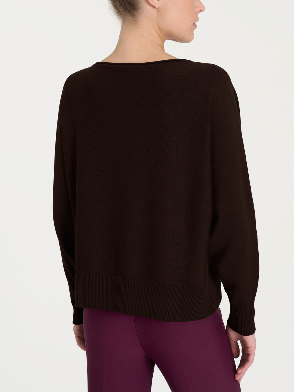 Con un escote barco que realza delicadamente los hombros y una confección sin costuras marcadas, este jersey presenta un ribete de canalé 2x2 en el bajo y los puños que define la línea con sobriedad y elegancia.