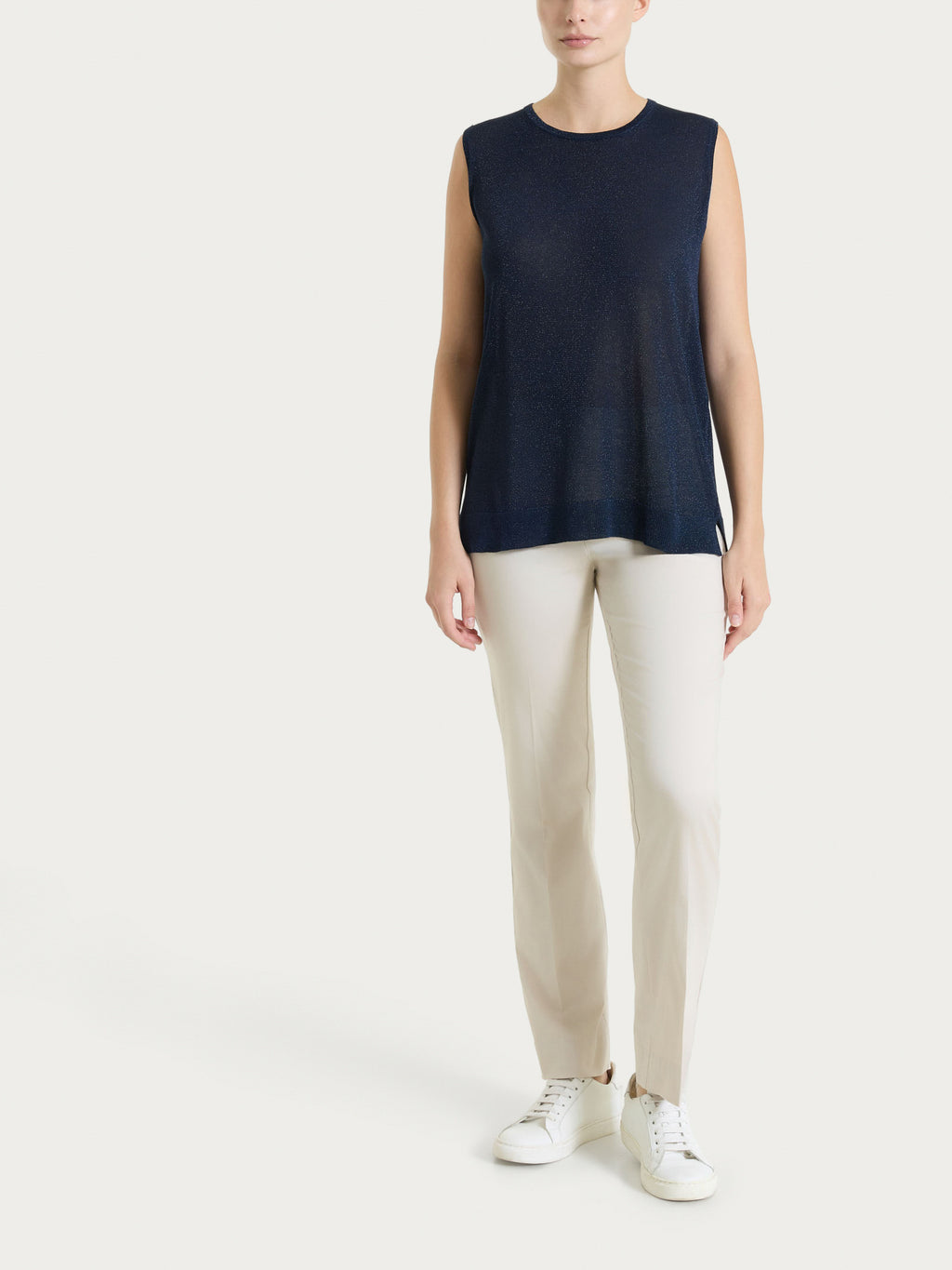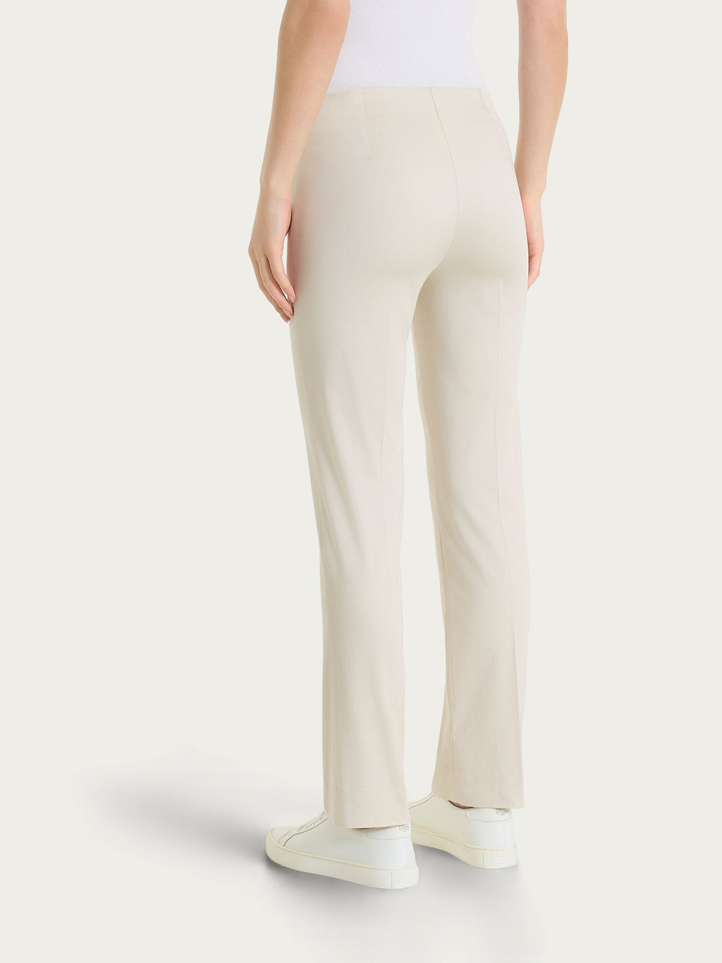Este modelo está confeccionado con cintura elástica y sin bolsillos; la pernera es acampanada. Tan cómodo como llevar unos leggings, pero manteniendo la elegancia de unos pantalones.