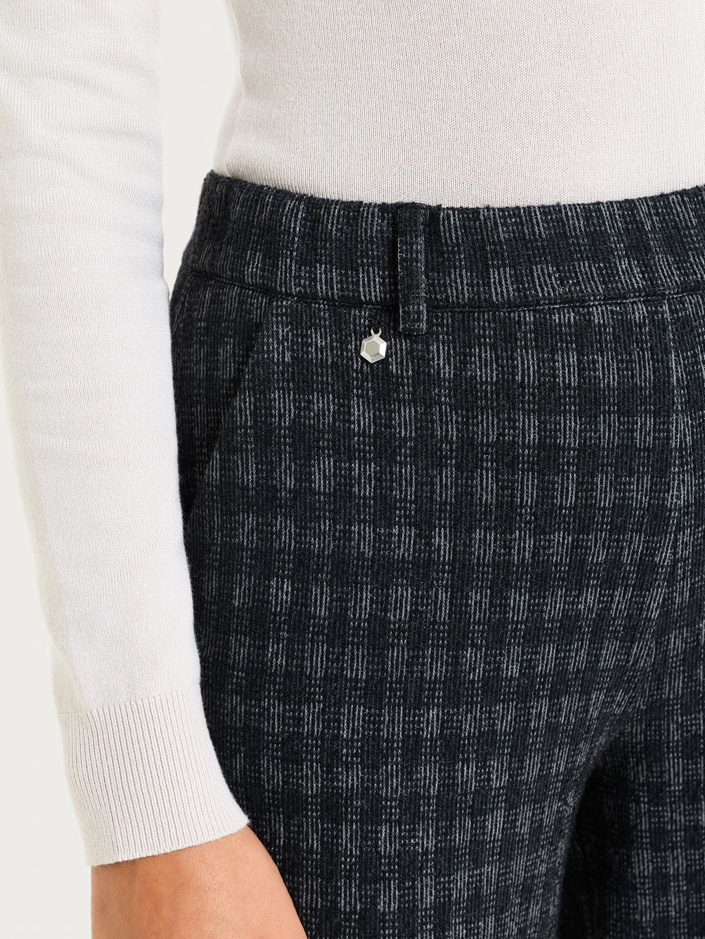 Confeccionada en Eco Jacquard, un punto Milano elástico que combina la estabilidad de los tejidos de lanzadera con la flexibilidad de los tejidos de punto, permitiendo la creación de elegantes patrones teñidos en hilo gracias al tejido jacquard.