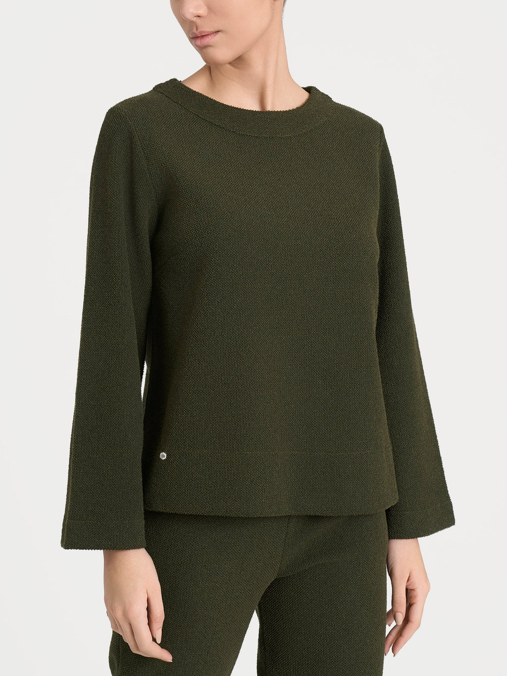 Esta prenda envuelve suavemente la base del cuello, dándole un aspecto elegante, al tiempo que garantiza un tacto suave y cómodo sobre la piel. Las mangas anchas se ciñen ligeramente al cuerpo, sin oprimirlo, y están rematadas con un dobladillo que también se repite en el bajo de la prenda.