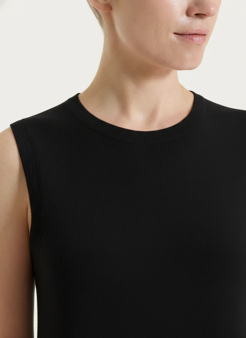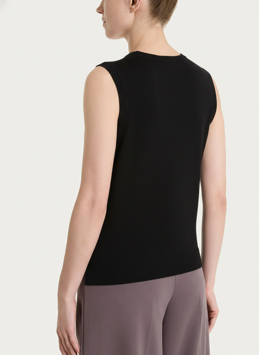 Chaleco corto de mujer sin mangas y de cuello redondo, confeccionado en galga 12.