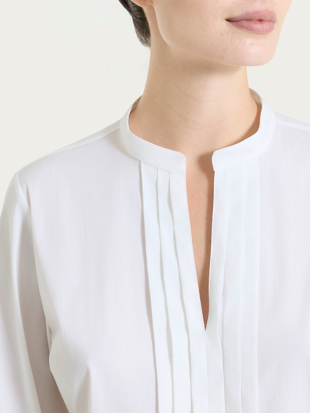 Camicia da donna con manica 3/4, scollo a V e pieghe sul davanti, dal design curato ed essenziale.