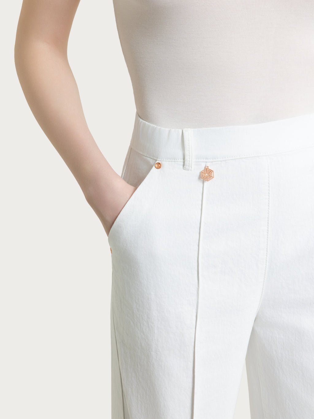 Questo modello è costruito con vita piatta elasticizzata ma con i passanti per la cintura per permetterti di aggiungere quel tocco di stile personale in più, con comode tasche laterali alla francese.