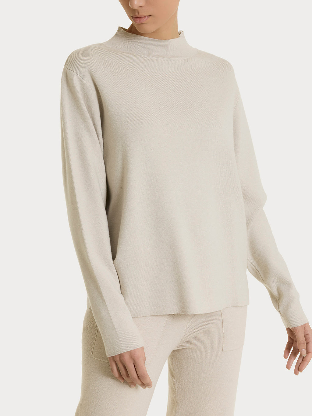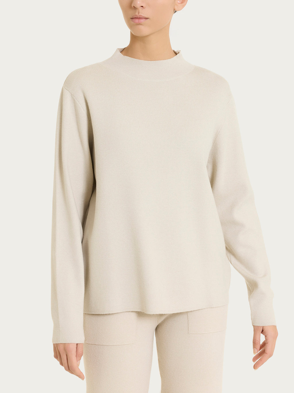 Lo scollo, morbido e leggermente rialzato, avvolge il collo con delicatezza senza costringere; un dettaglio raffinato che dona carattere al capo e lo rende perfetto per affrontare le giornate più fresche con stile e comfort.