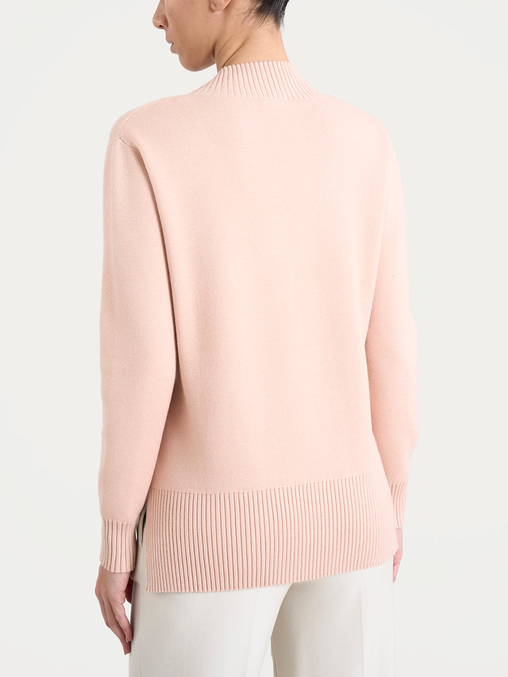 Il fondo asimmetrico, con spacchetti laterali e una parte posteriore leggermente più lunga, aggiunge movimento alla linea e valorizza la silhouette con discrezione.