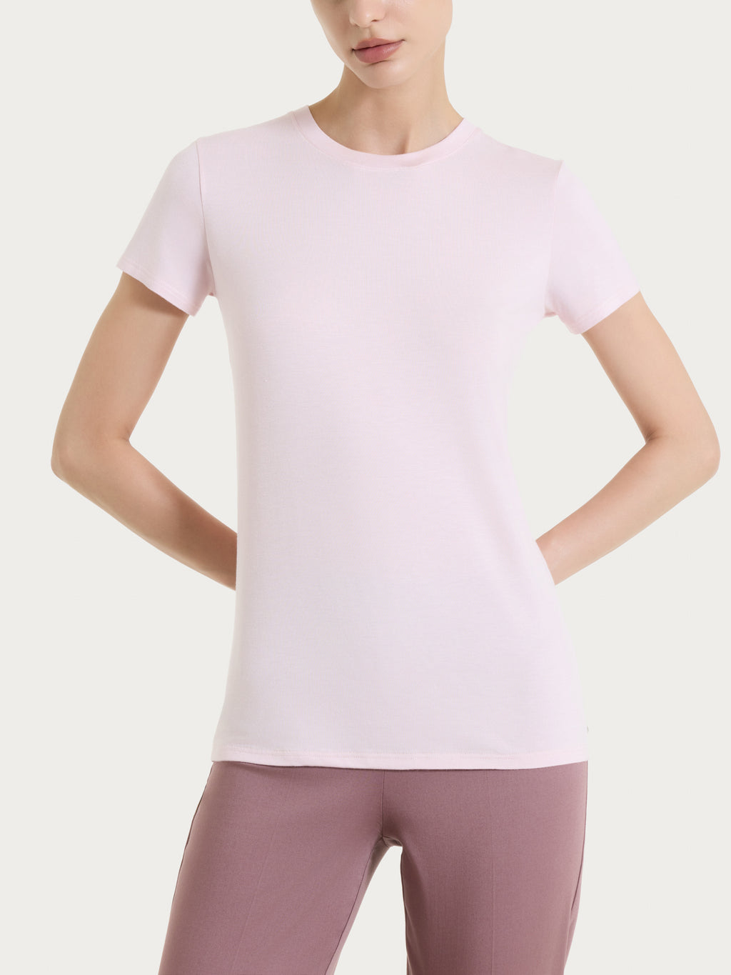 Maglietta girocollo chiuso con maniche corte.