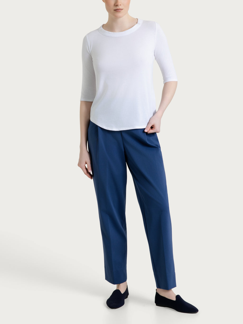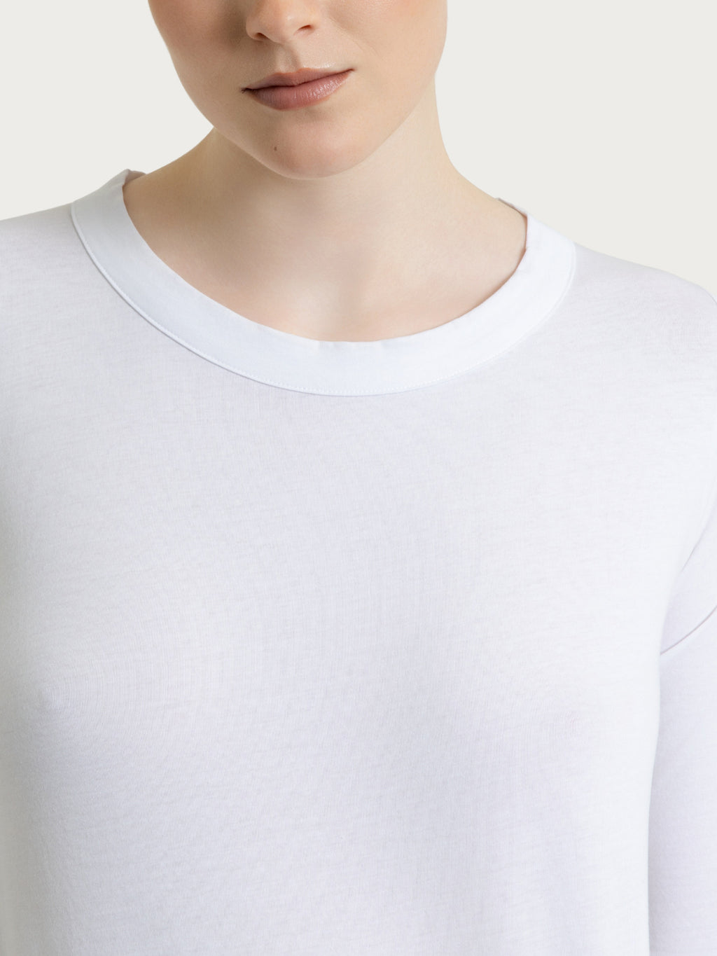 Il girocollo definisce la scollatura con un profilo semplice e ordinato, facile da abbinare e perfetto anche sotto giacche o cardigan. La manica 3/4 copre delicatamente il braccio e rende il capo ideale per le mezze stagioni e per le giornate più miti, unendo praticità e femminilità.
