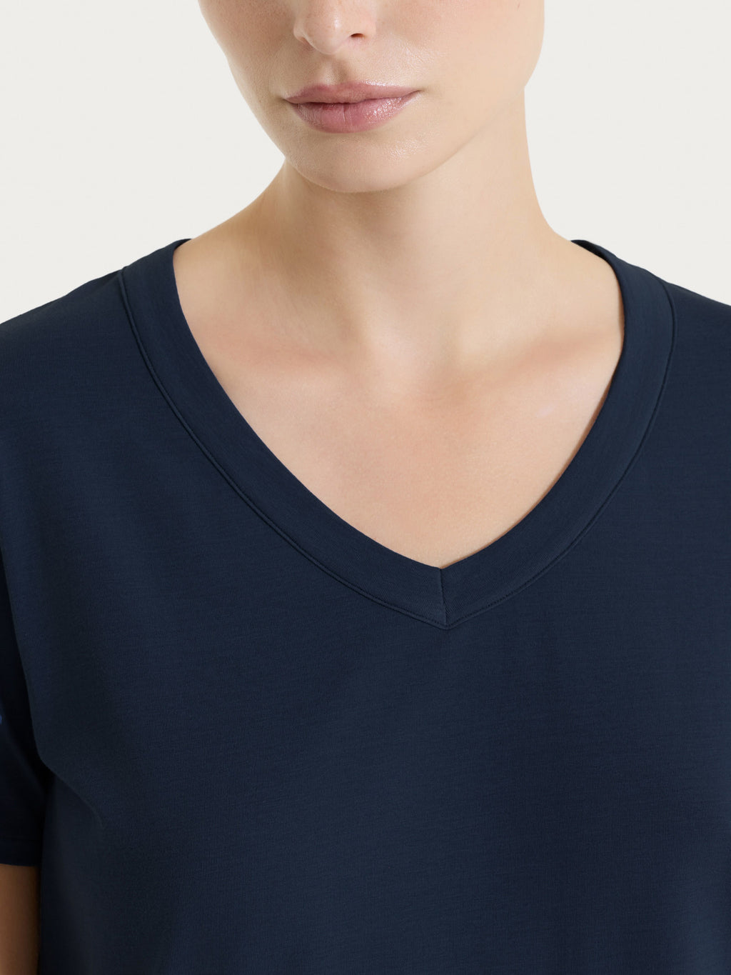Lo scollo a V definisce la scollatura con una linea pulita e slanciata, mentre la manica corta la rende ideale per la stagione calda e per outfit pratici da indossare ogni giorno.