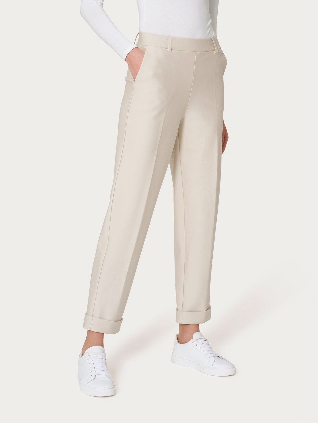Il tessuto compact light offre comfort e traspirabilità, rendendo questo pantalone adatto a molte occasioni nonostante il calore delle giornate estive.