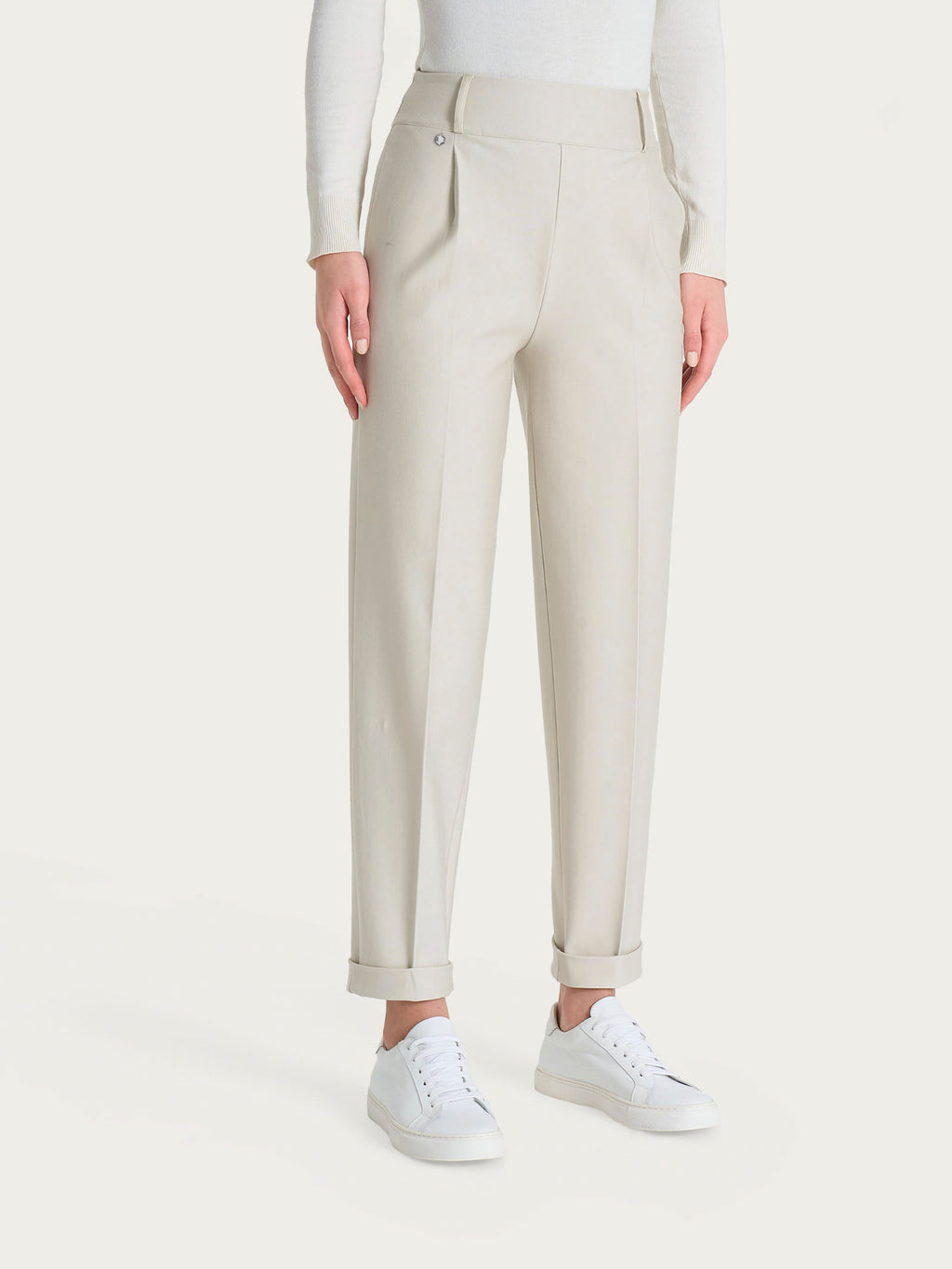Caratterizzato dalla presenza di comode tasche laterali ed eleganti pinces, questo modello è costruito con vita elasticizzata ma con i passanti per la cintura per permetterti di aggiungere quel tocco di stile personale in più, comodo come indossare un leggings pur mantenendo l'eleganza di un pantalone.