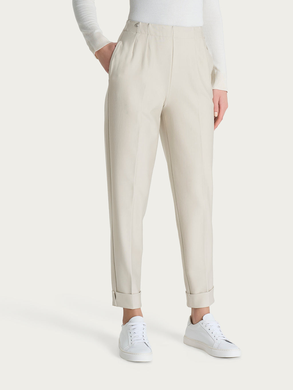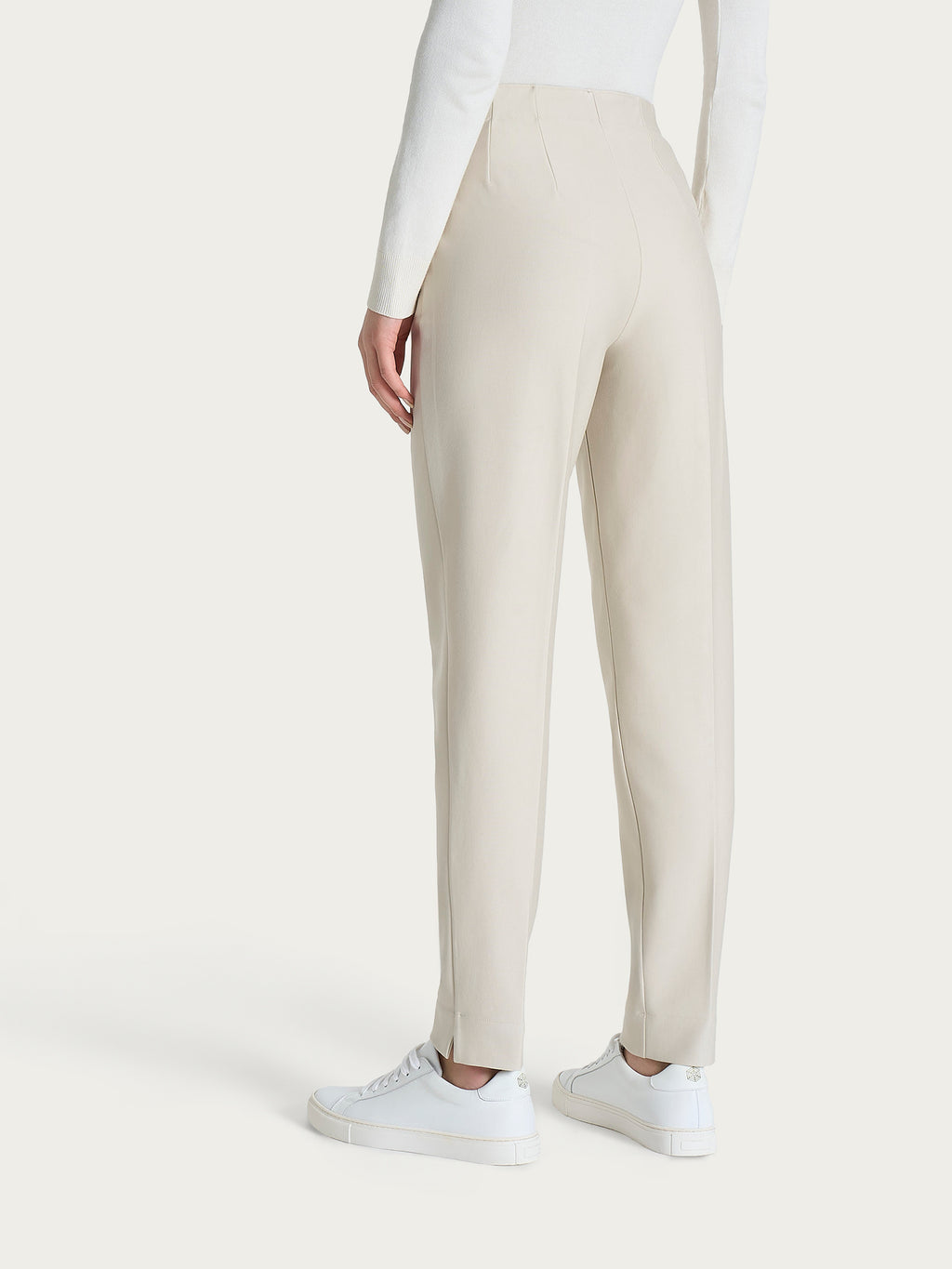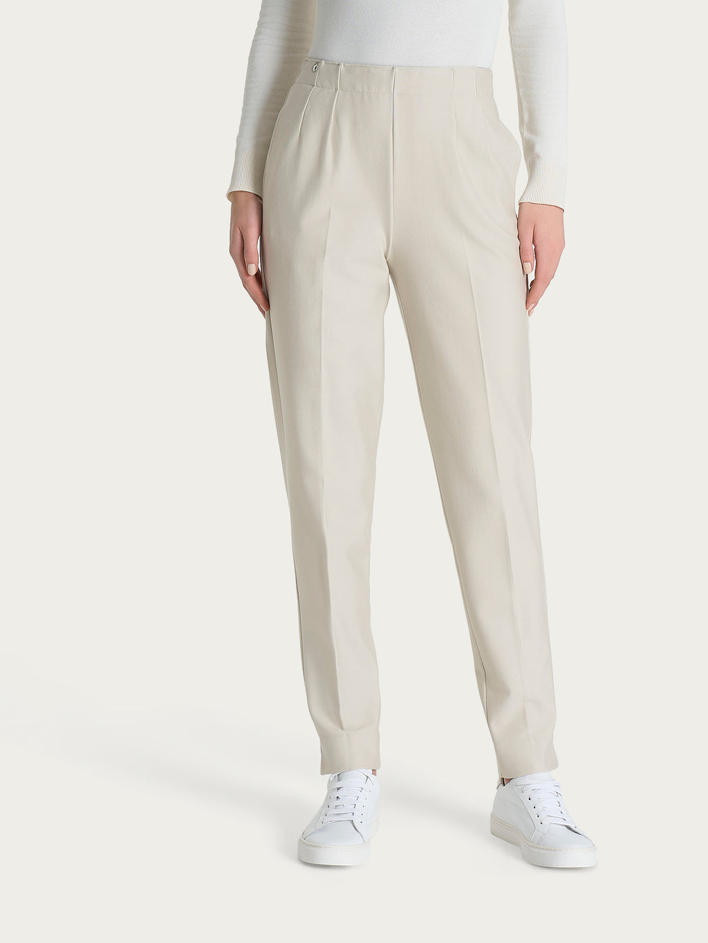 Pantalone a carota da donna con vestibilità tapered, la gamba leggermente ampia si stringe verso la caviglia.
