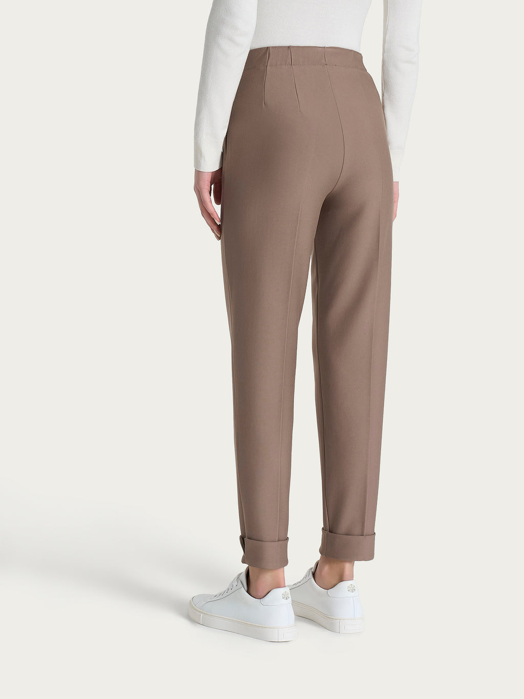 Pantalone a carota da donna con vestibilità tapered, la gamba leggermente ampia si stringe verso la caviglia.