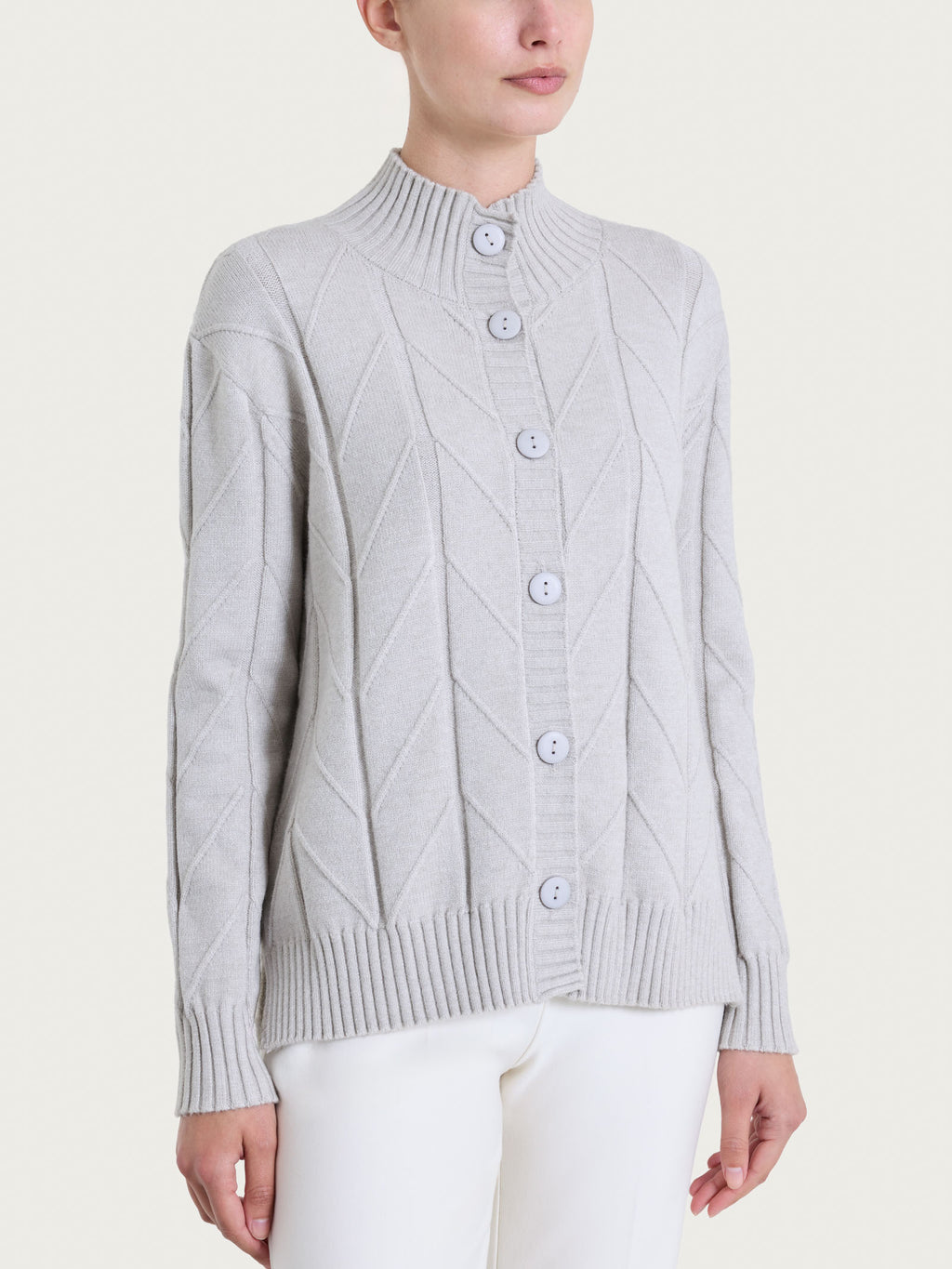 Questo cardigan aperto con collo alto lupetto scende dolcemente lungo i fianchi, creando una linea fluida che valorizza la silhouette con un look semplice ma elegante.