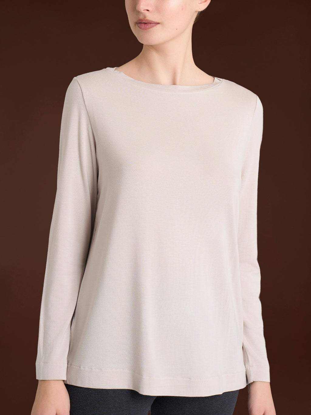 Questo capo con una vestibilità è morbida e fluida, per una maggiore comodità e praticità quotidiana, è tinta unita con collo a barchetta e a manica lunga.
