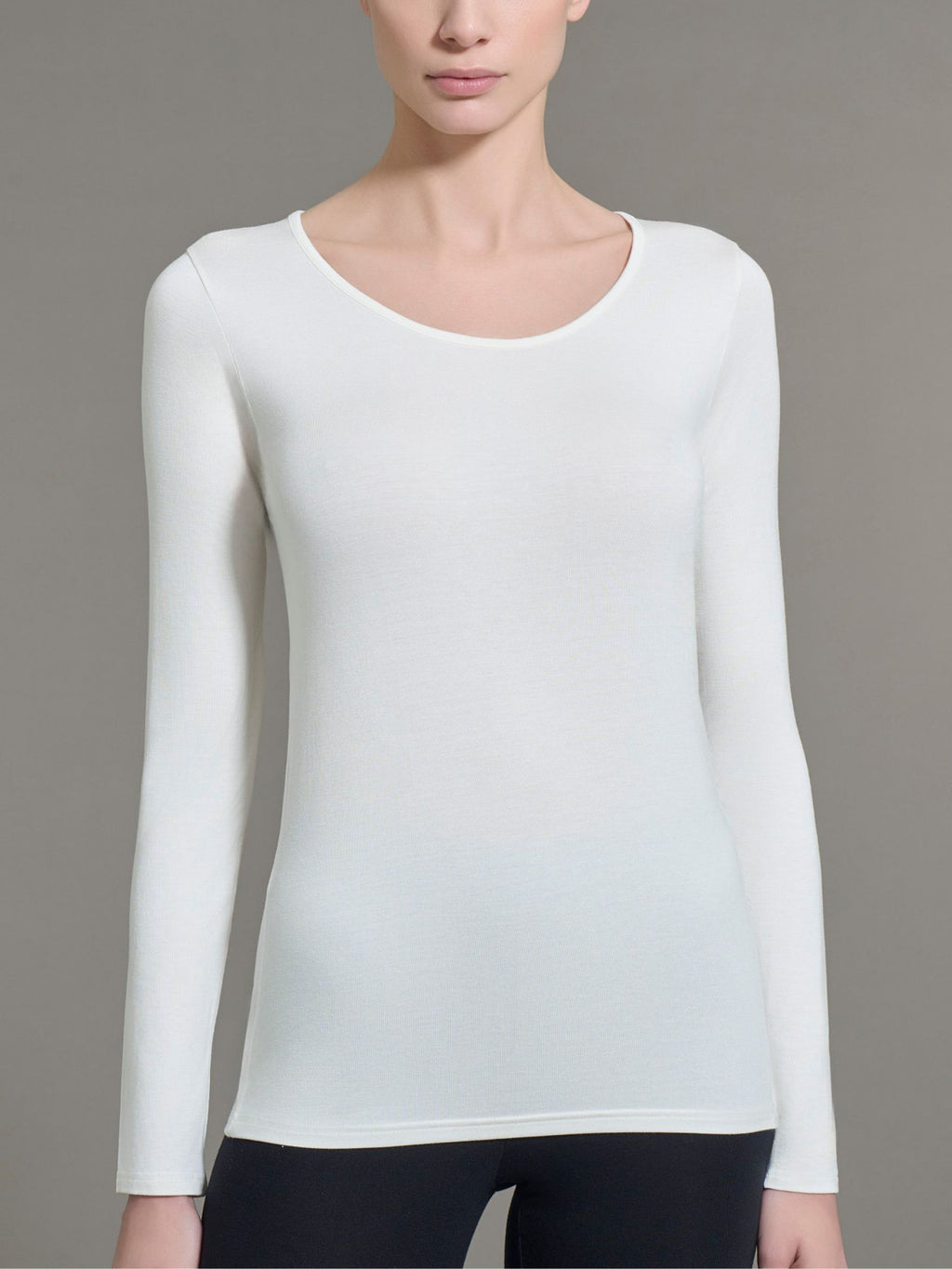 Maglia girocollo a manica lunga da donna in ecoviscosa, una delicata viscosa elasticizzata calda e morbida.