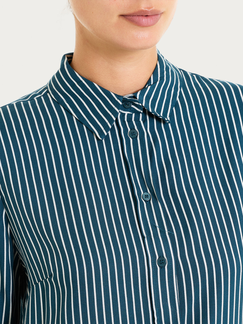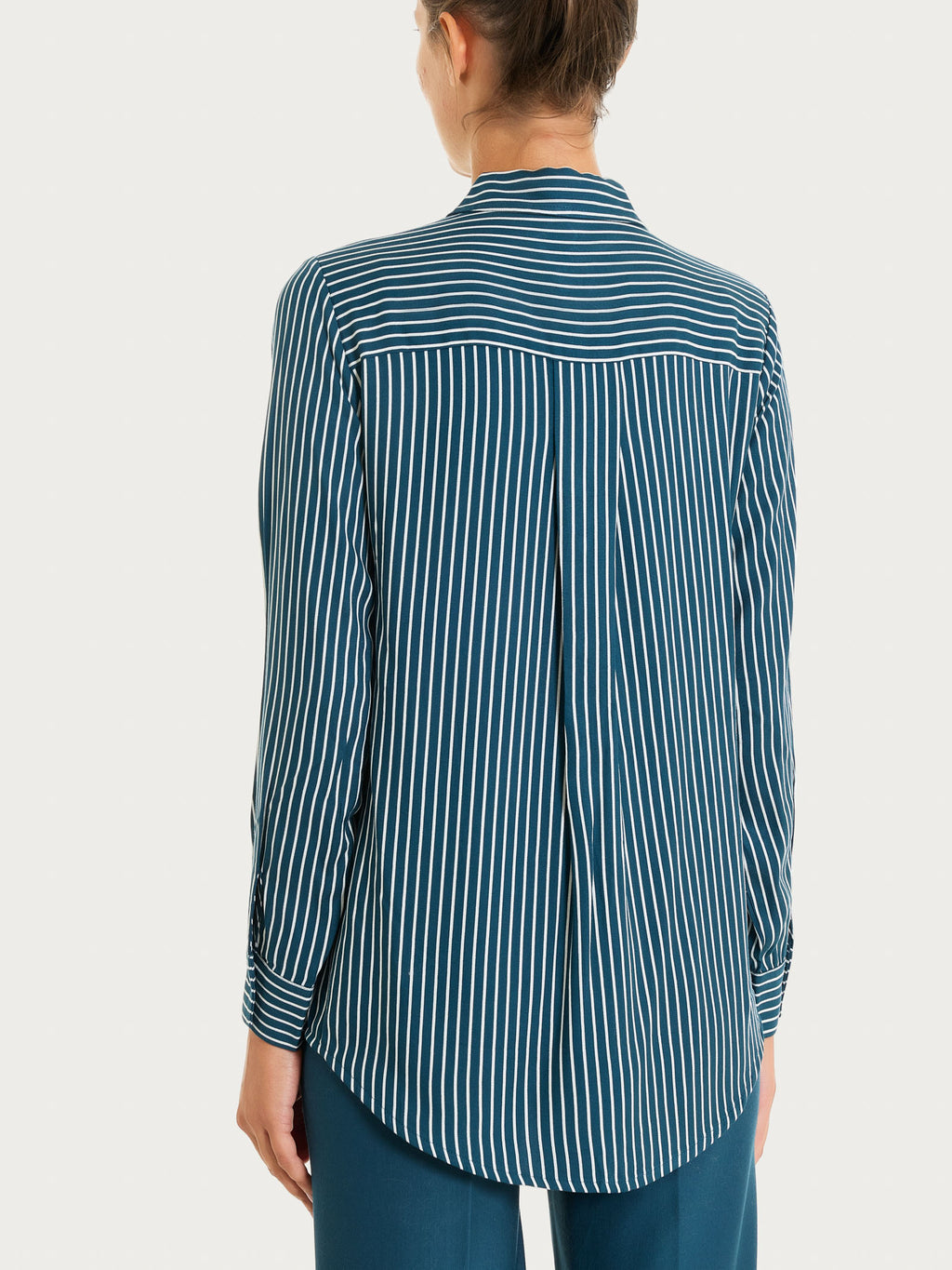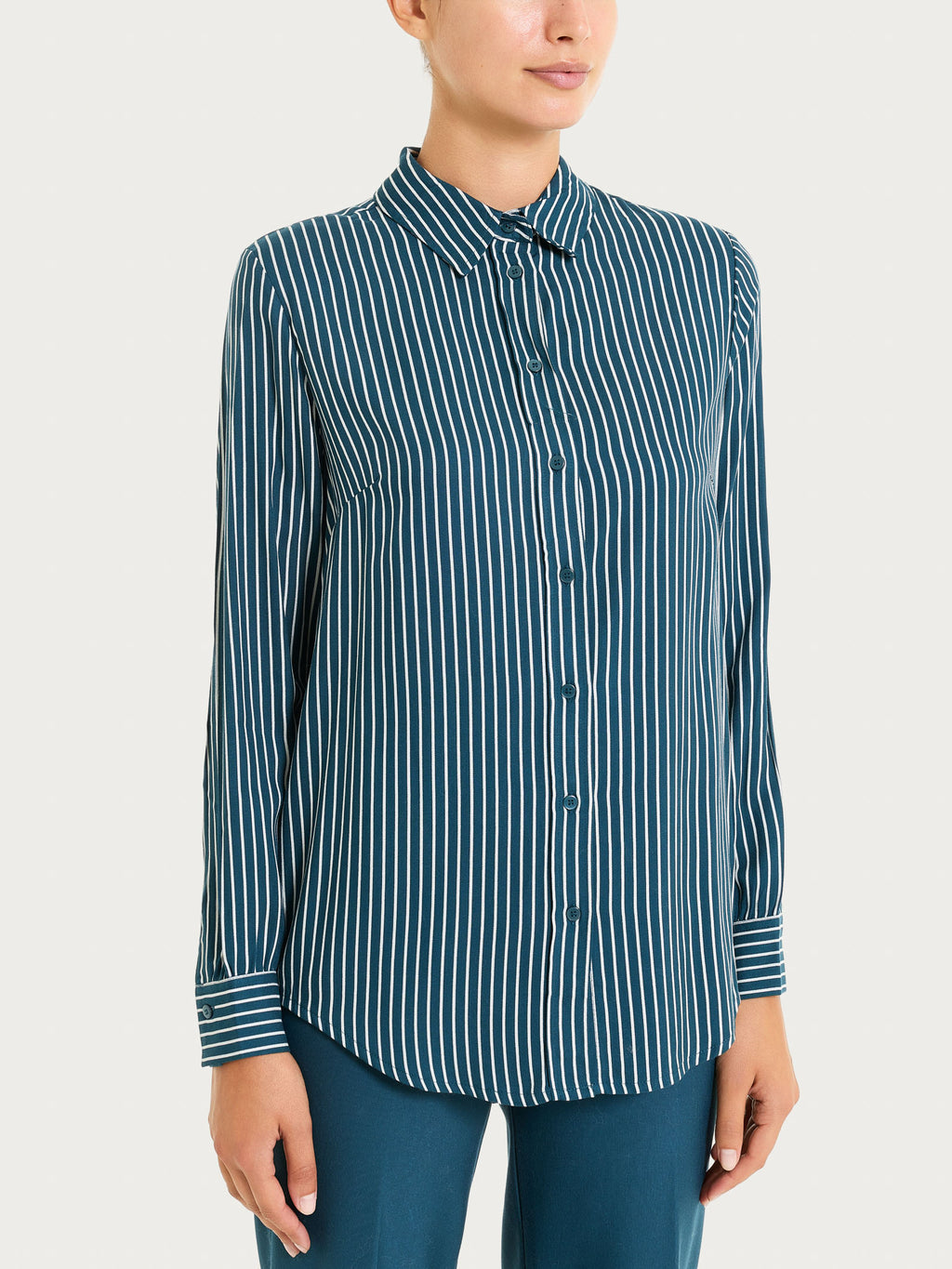 Caratterizzato da una fantasia a righe che scendono delicatamente su tutto il capo ripetendosi regolarmente e con una chiusura con bottoncino sui polsi per facilitarne l’indosso senza comprometterne l’eleganza.