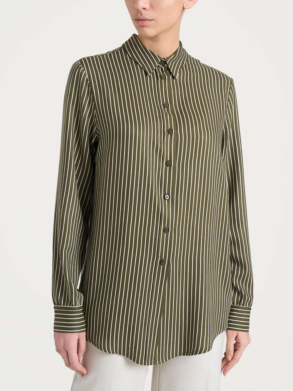 Caratterizzato da una fantasia a righe che scendono delicatamente su tutto il capo ripetendosi regolarmente e con una chiusura con bottoncino sui polsi per facilitarne l’indosso senza comprometterne l’eleganza.