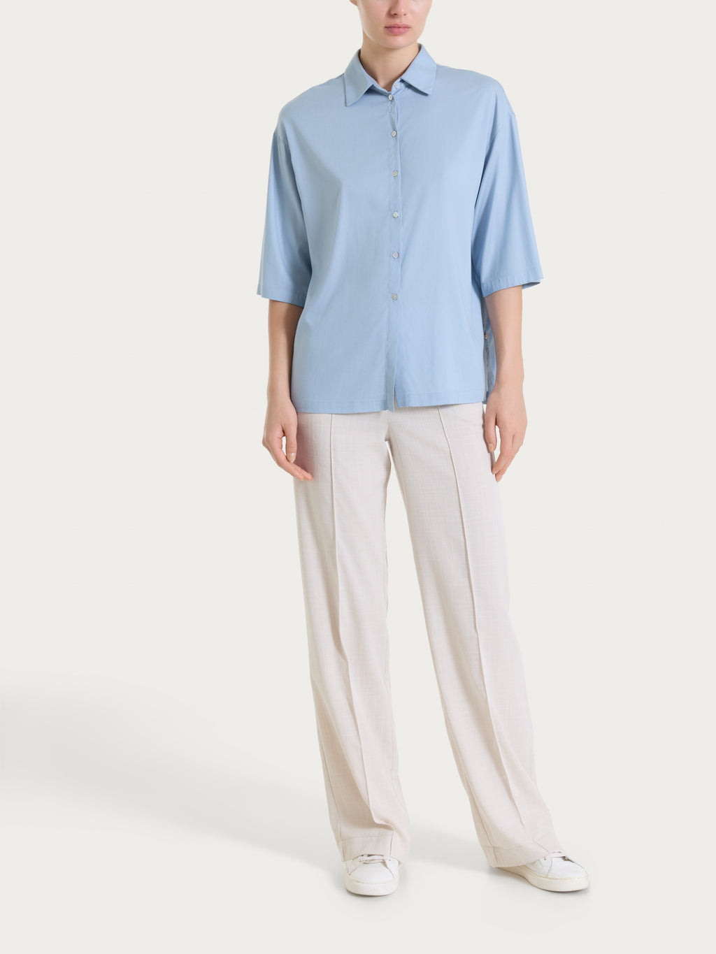 Camicia da donna con manica ampia 3/4 e pratica chiusura frontale con bottoncini. Proposta in tinta unita, ha una vestibilità soft che cade morbida sul corpo, ideale per un uso quotidiano nelle sta...