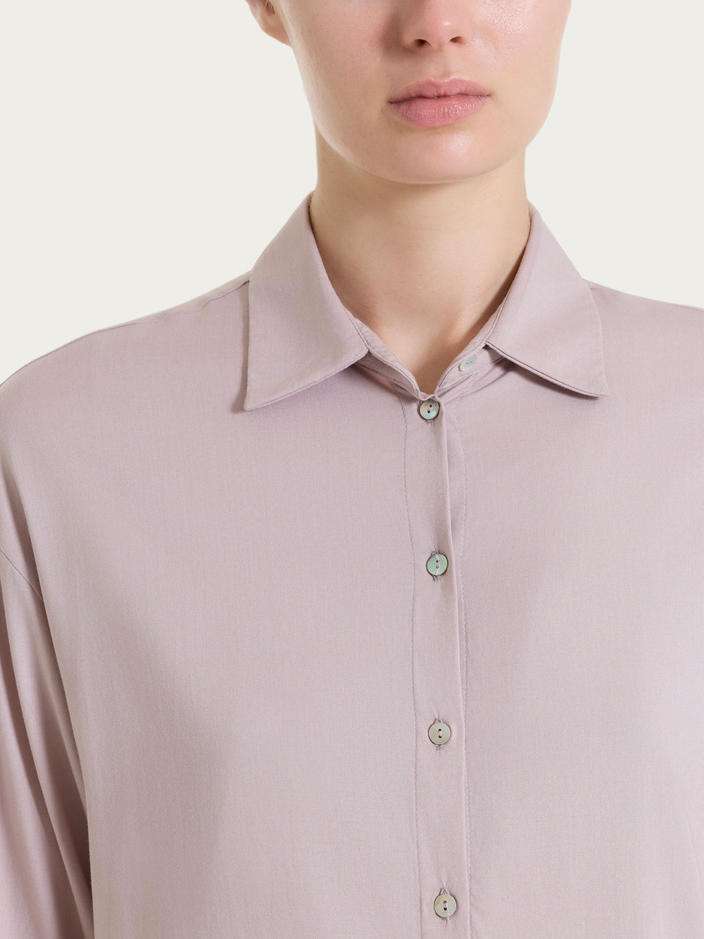 Camicia da donna con manica ampia 3/4 e pratica chiusura frontale con bottoncini. Proposta in tinta unita, ha una vestibilità soft che cade morbida sul corpo, ideale per un uso quotidiano nelle sta...