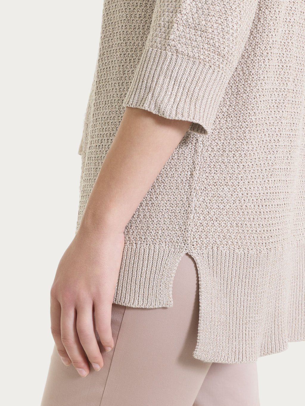 Realizzato in maglia rasata di finezza 5 con punto traforato, che dona al capo leggerezza e un elegante effetto decorativo.