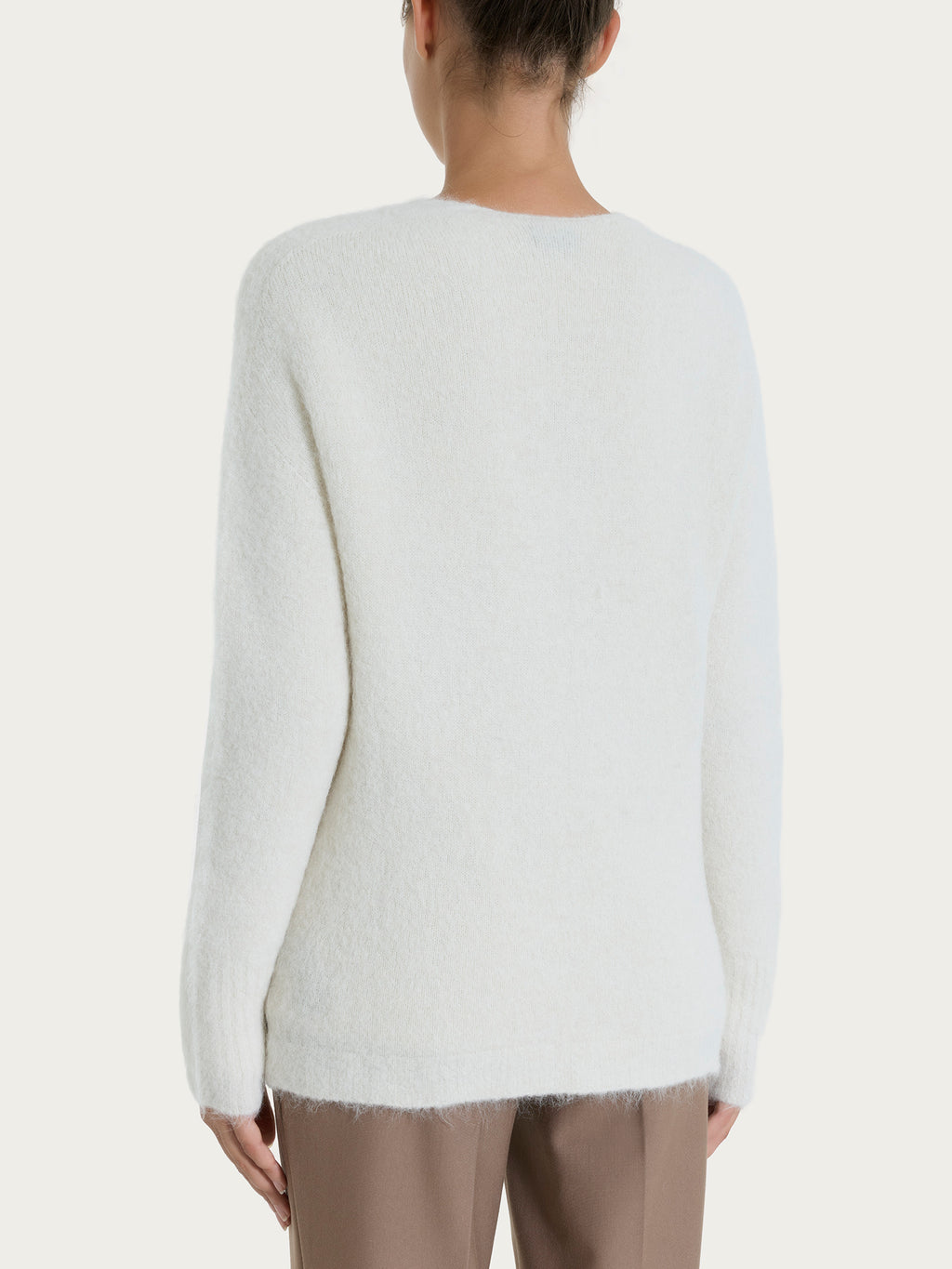 Cardigan aperto corto senza bottoni e con le maniche lunghe in misto lana e alpaca, tessuto in finezza 7, caldo, morbido e voluminoso.