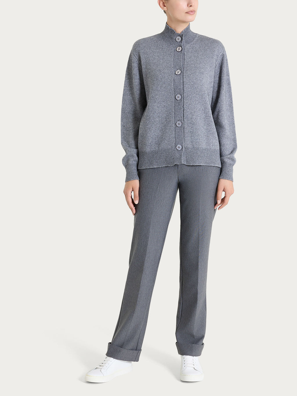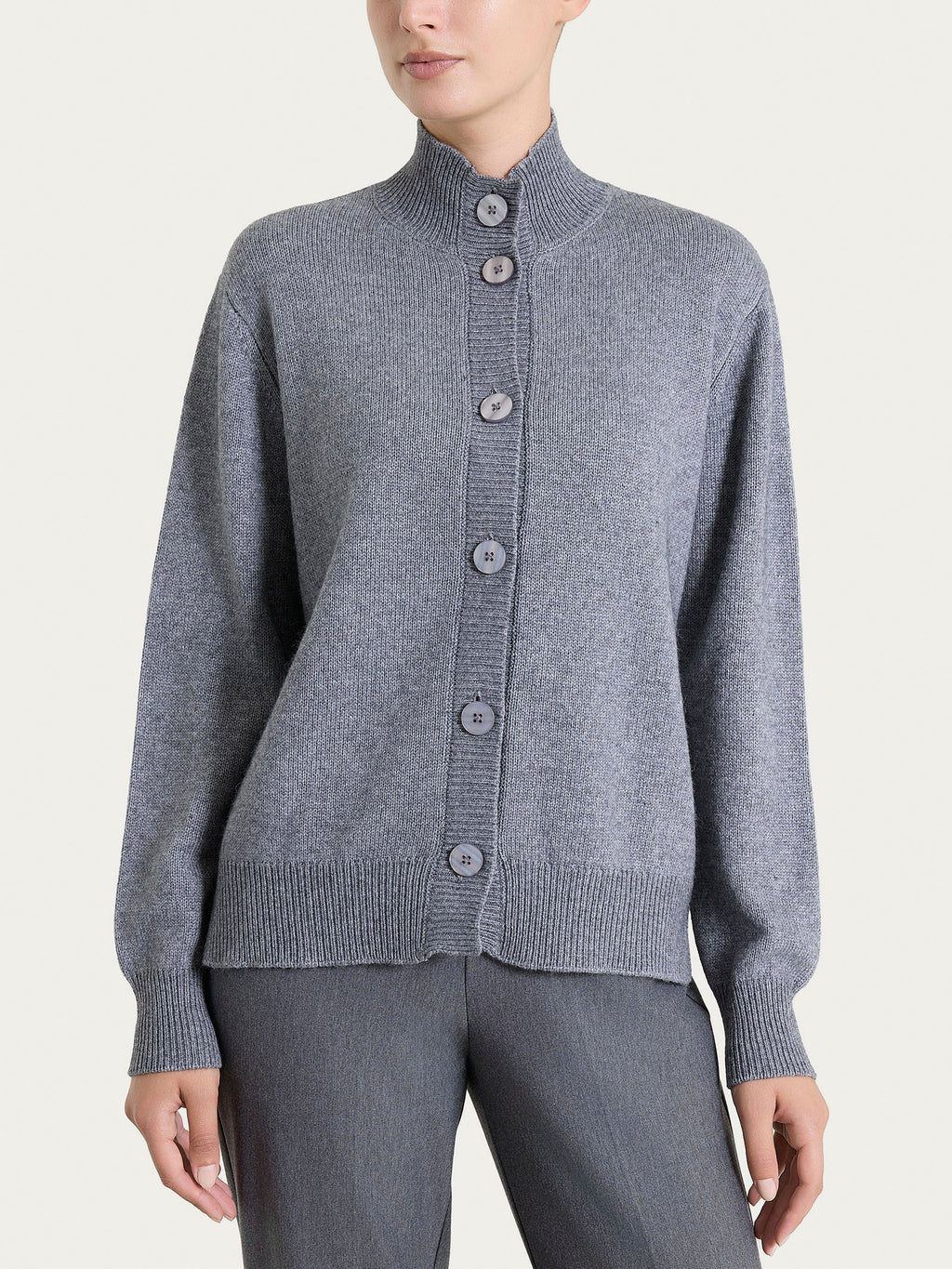 Cardigan corto da donna con chiusura a bottoni, collo alto e maniche lunghe.