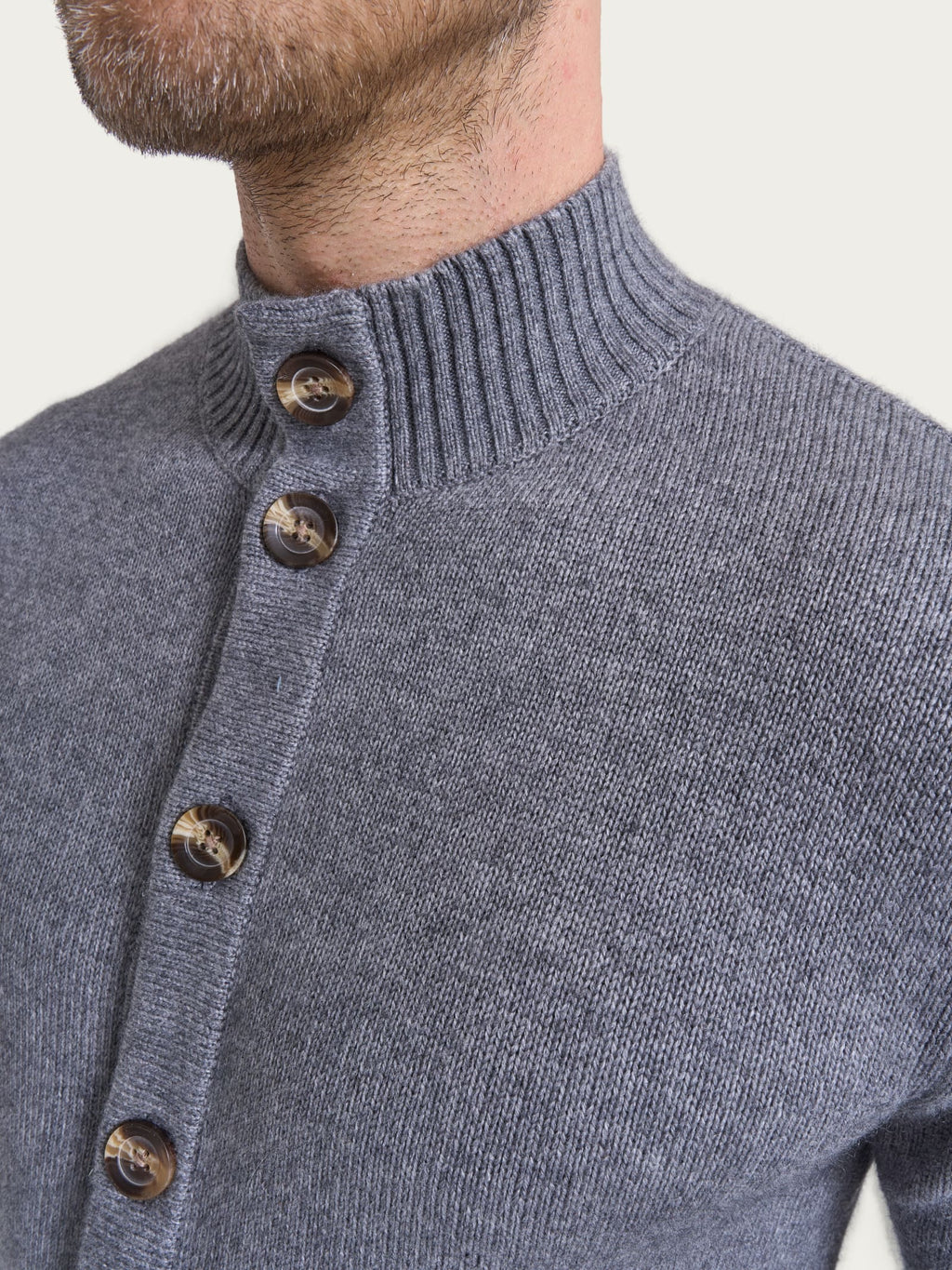 Caratterizzato da un delicato scollo a V con chiusura a cinque bottoni, è rifinito con bordatura e polsini in costina 2x2 che ne esaltano il comfort e la cura nei dettagli.
