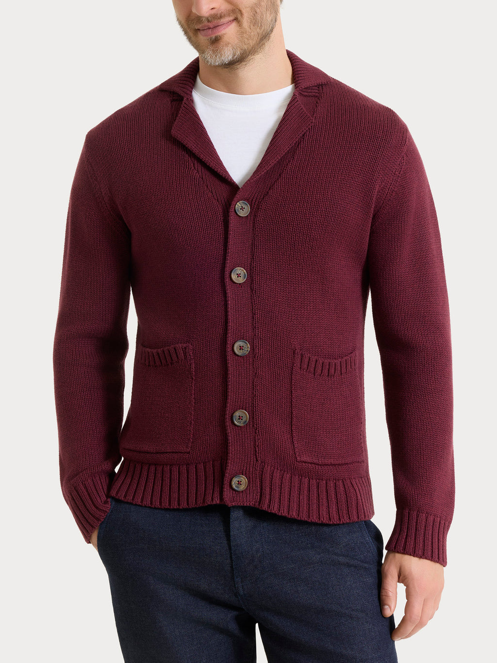 Caratterizzato da un elegante scollatura con rever classico, chiusura con cinque bottoni e pratiche tasche laterali, è rifinito con bordatura e polsini in costina 2x2 che ne esaltano il comfort e la cura nei dettagli.