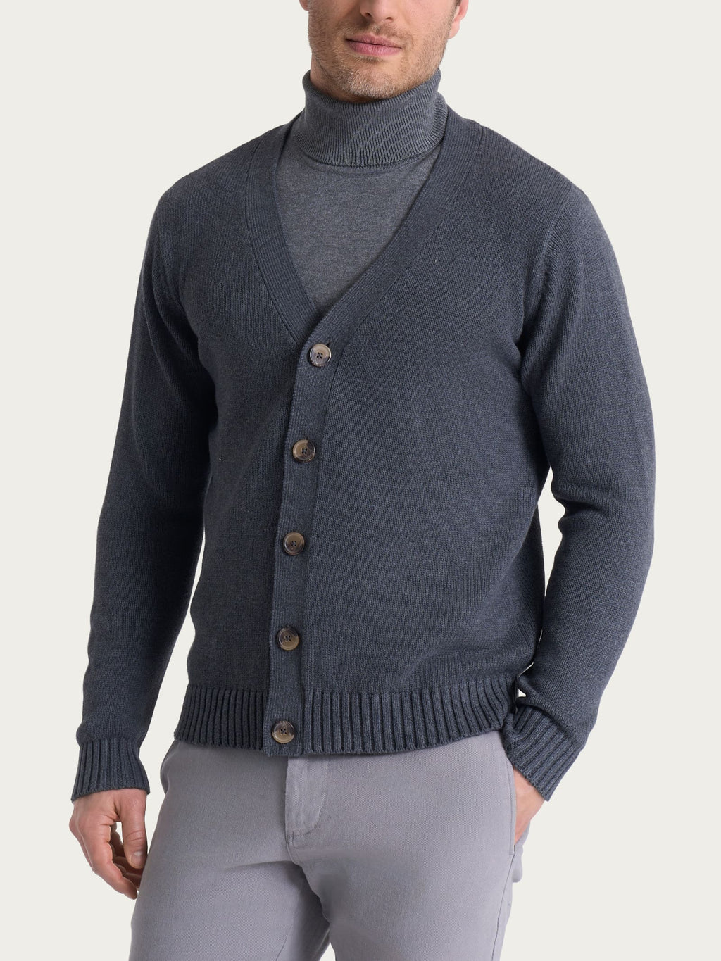 Cardigan con scollo a V da uomo in maglia rasata di puro cotone, tessuto in finezza 5, leggero e confortevole senza compromettere l'inconfondibile calore.