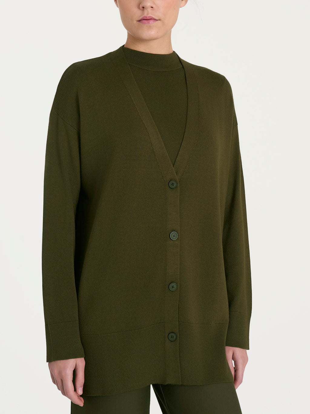 Cardigan lungo da donna con manica lunga, realizzato in morbido misto viscosa e lavorato in finezza 12 per garantire calore e comfort.