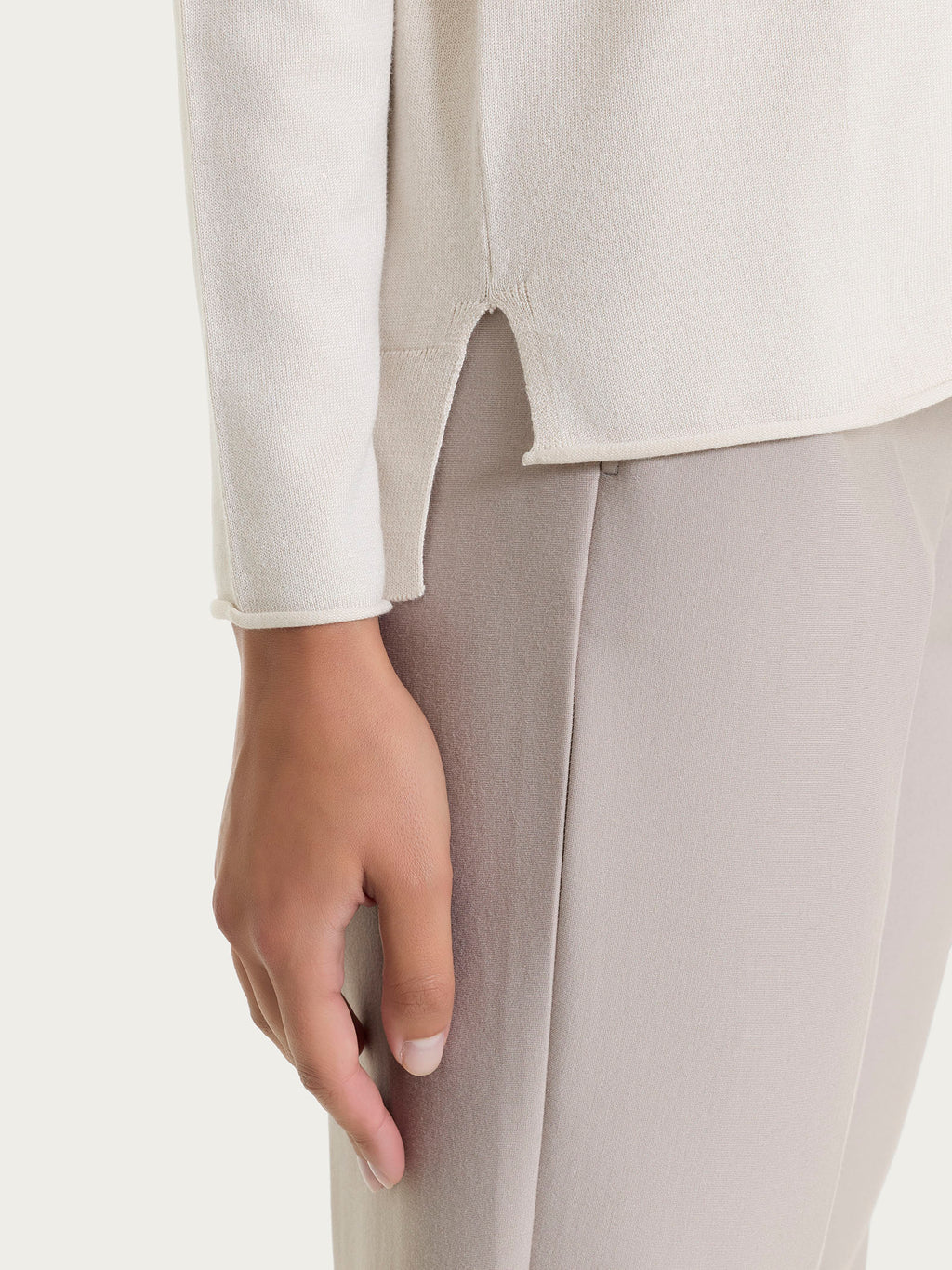 Questo modello presenta una linea asimmetrica, con il retro leggermente più lungo del davanti e piccoli spacchetti laterali sul fondo, rifinito da un'elegante bordatura in costina 1x1.