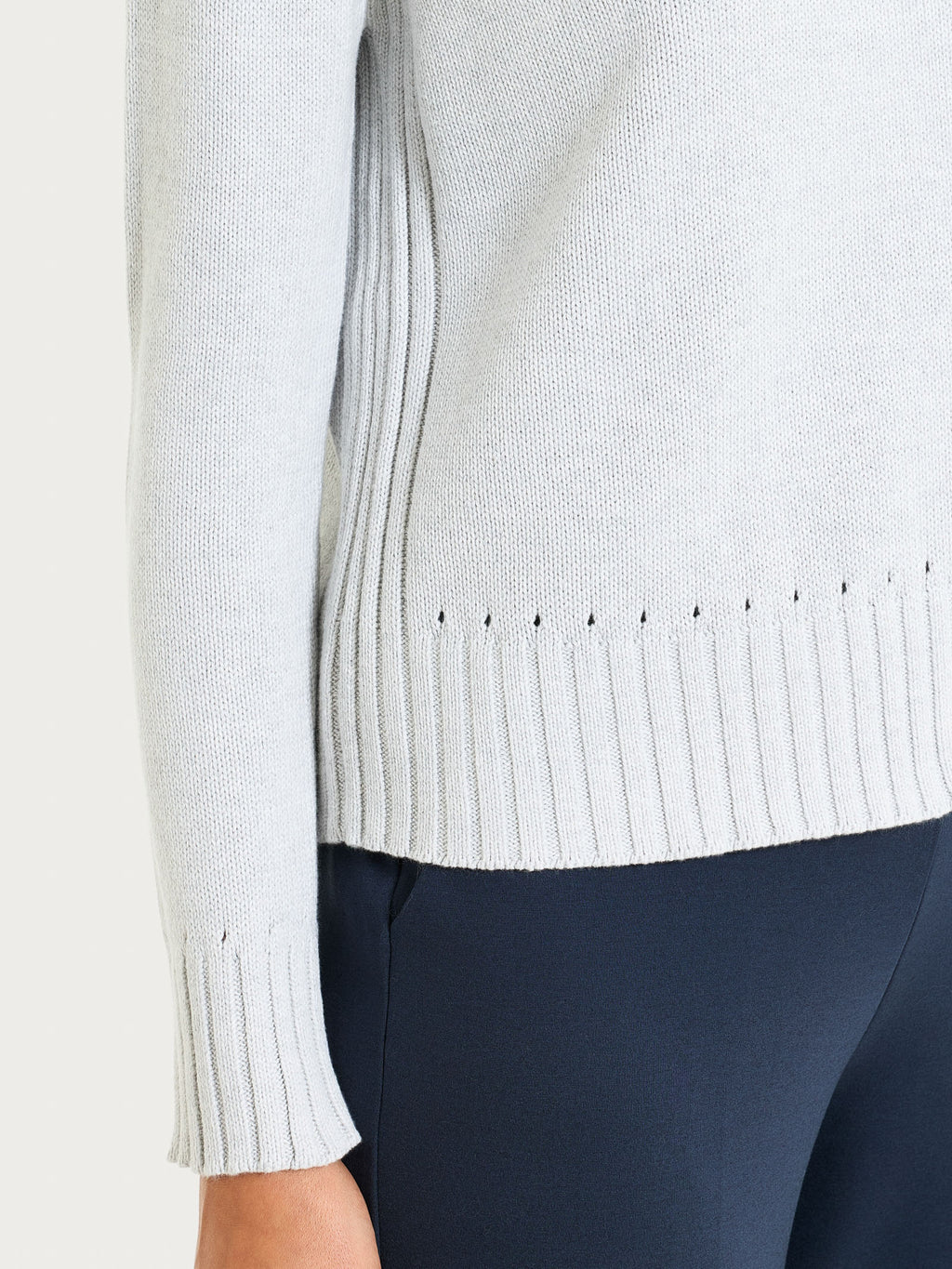Questo capo tinta unita, realizzato in morbida maglia rasata ha una bordatura in costa 3x2 che impreziosisce sia il fondo che i polsini, oltre a definire con eleganza lo scollo, conferendo al design un tocco di struttura e ricercatezza.