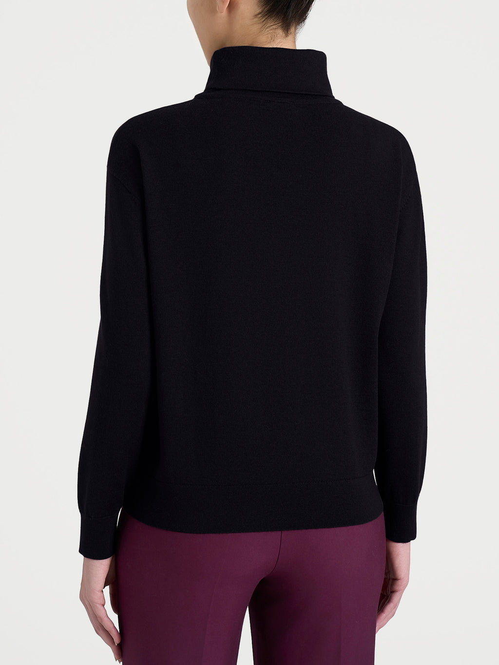 Questo modello è caratterizzato da un collo alto che, senza stringere, avvolge con delicatezza e dona calore, rifinito da una costina 1x1 che richiama quella presente anche su bordi e fondo per un effetto coerente e curato.