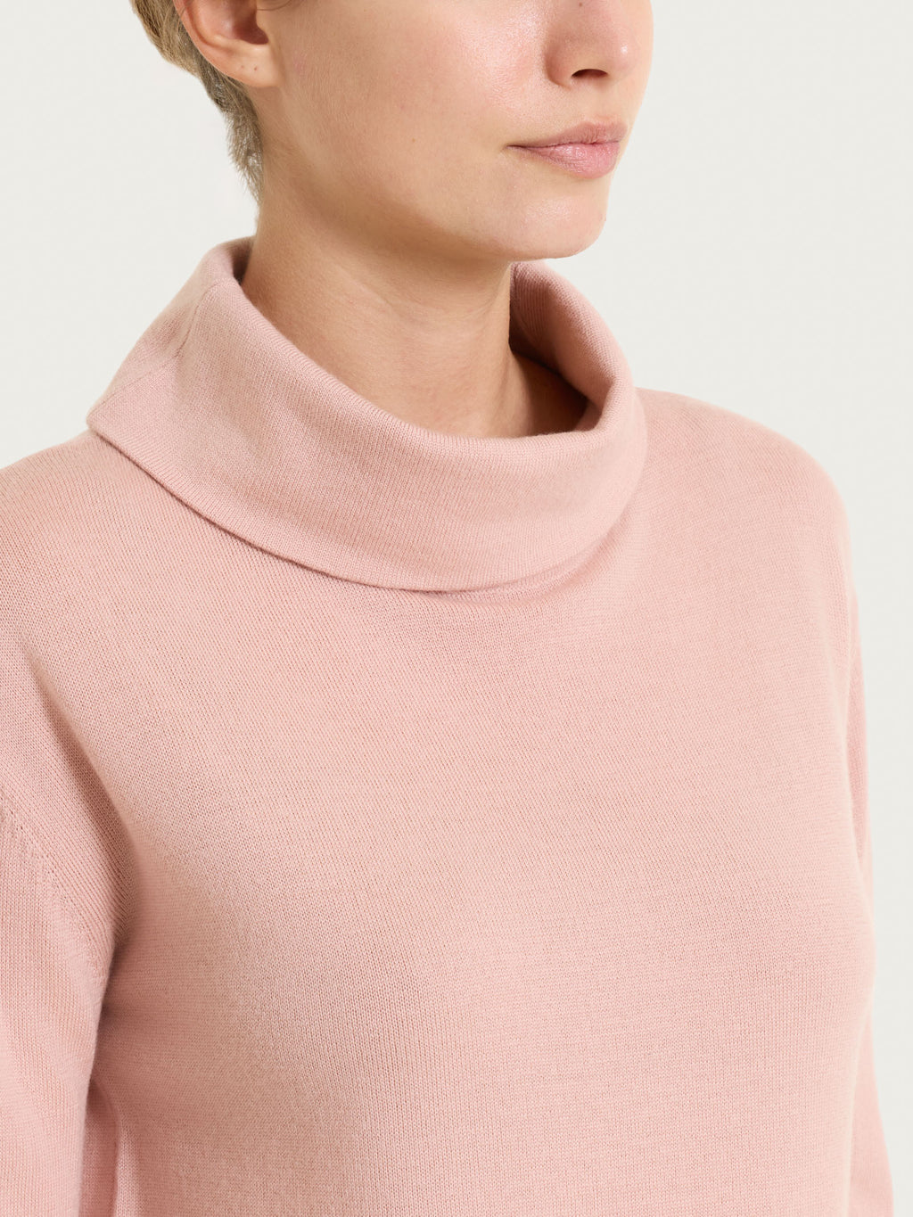 Questo modello è caratterizzato da un collo alto che, senza stringere, avvolge con delicatezza e dona calore, rifinito da una costina 1x1 che richiama quella presente anche su bordi e fondo per un effetto coerente e curato.