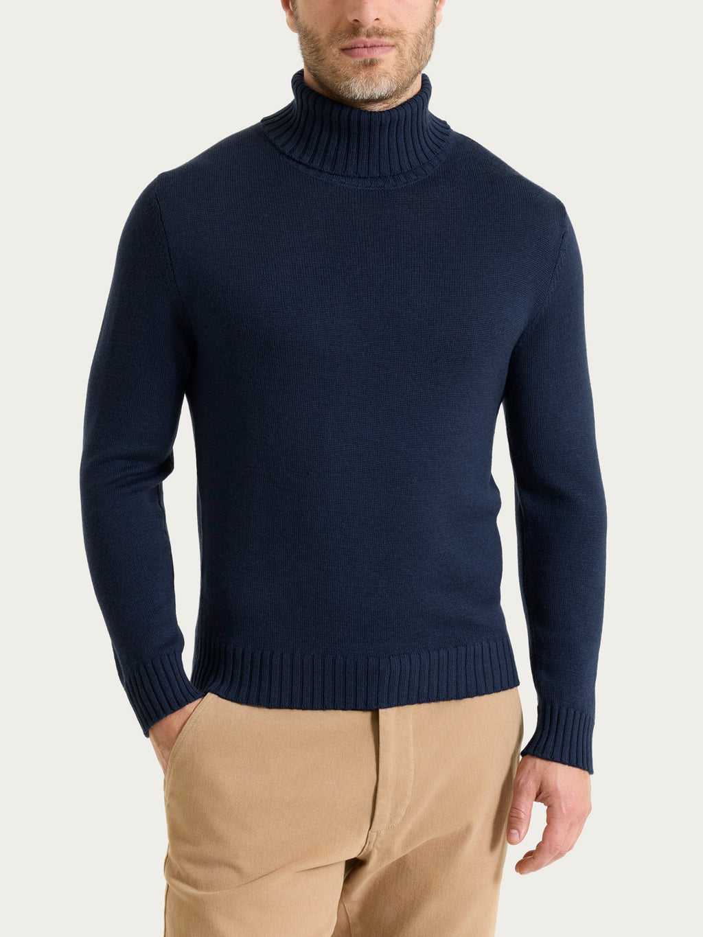 Dolcevita da uomo in maglia rasata con manica lunga in finezza 7. Questo modello con collo alto roulè è caratterizzato è delineato da una costina 3x3 ch...