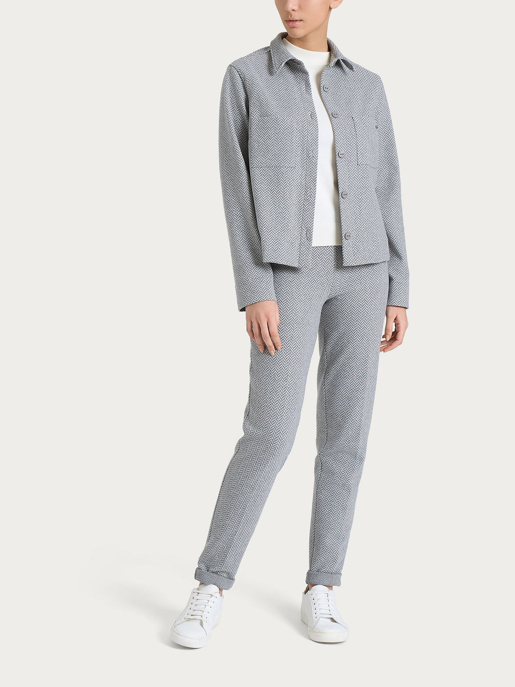 Realizzato in Eco Jacquard, un punto Milano elasticizzato che unisce la stabilità dei tessuti navetta con la flessibilità della maglia, permettendo la creazione di eleganti disegni tinto filo grazie alla tessitura jacquard.
