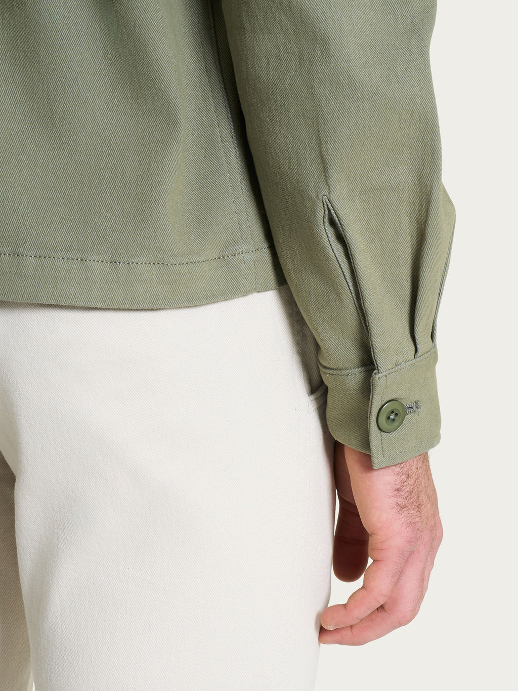 Realizzata in Raw Twill di cotone elasticizzato, un tessuto robusto ma flessibile, assicura comfort nei movimenti e resistenza all’usura quotidiana.