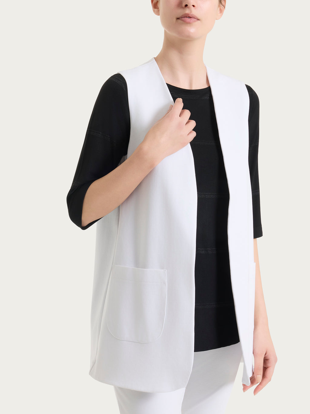 L’assenza di collo mantiene la forma semplice e contemporanea, mettendo in risalto l’outfit e rendendolo facile da abbinare sia a pantaloni eleganti sia a denim e capi più casual.