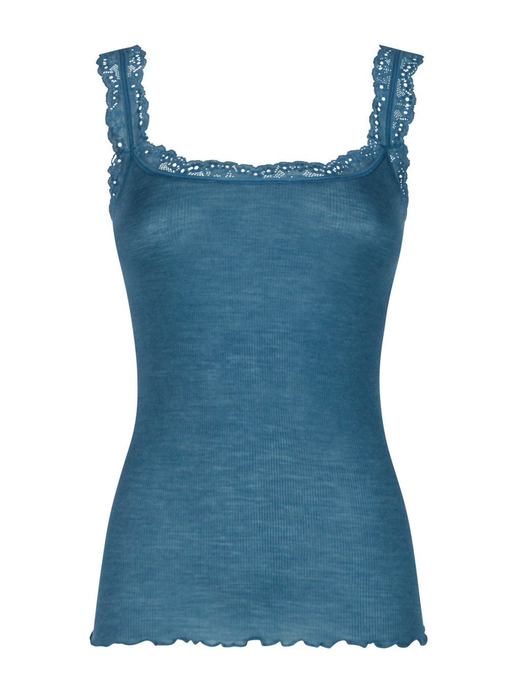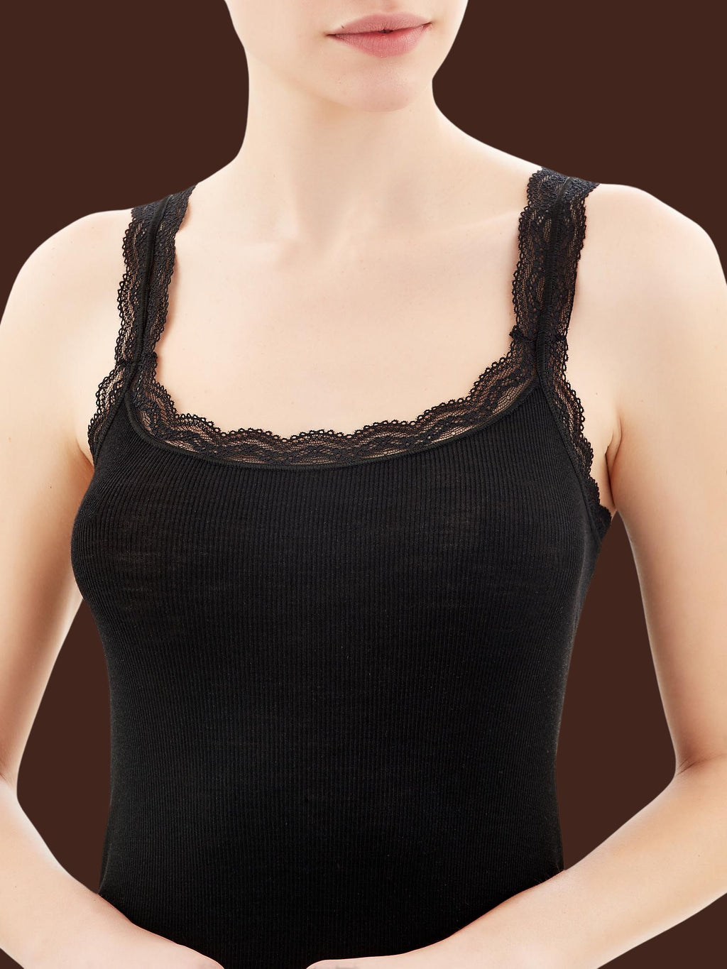 Canottiera a spalla stretta in costina 2x1 di lana e seta impreziosita dalla bordo della scollatura in lace di pizzo.