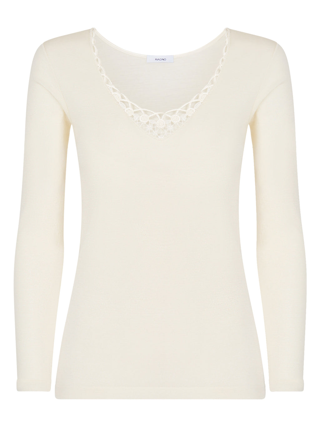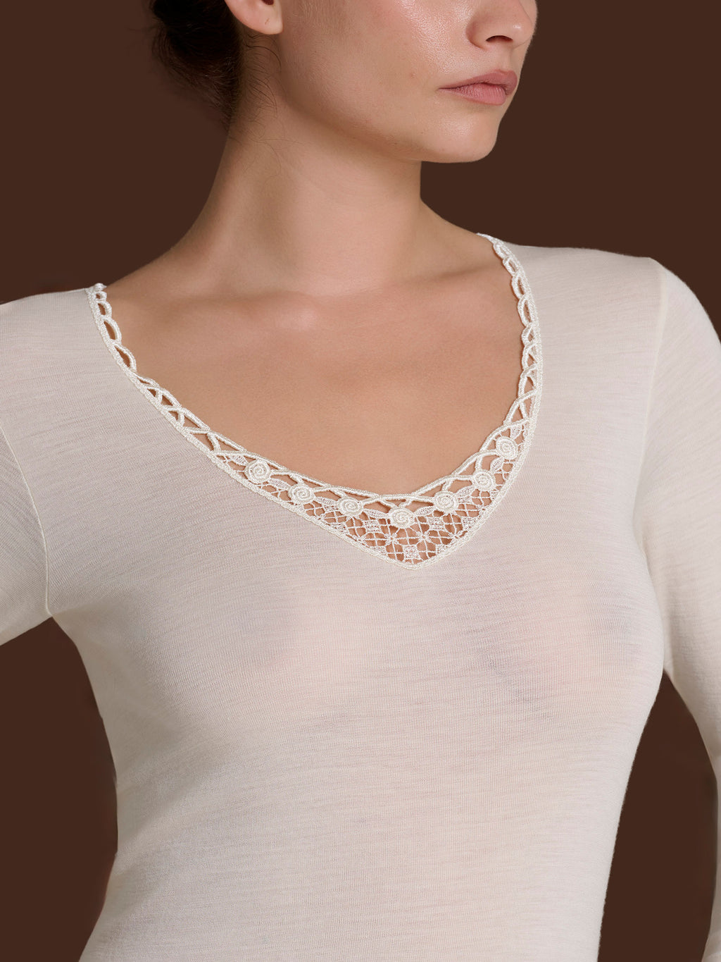Maglietta girocollo a manica lunga in preziosa maglia unita di lana e seta caratterizzata dal bordo della scollatura in pizzo macramè.