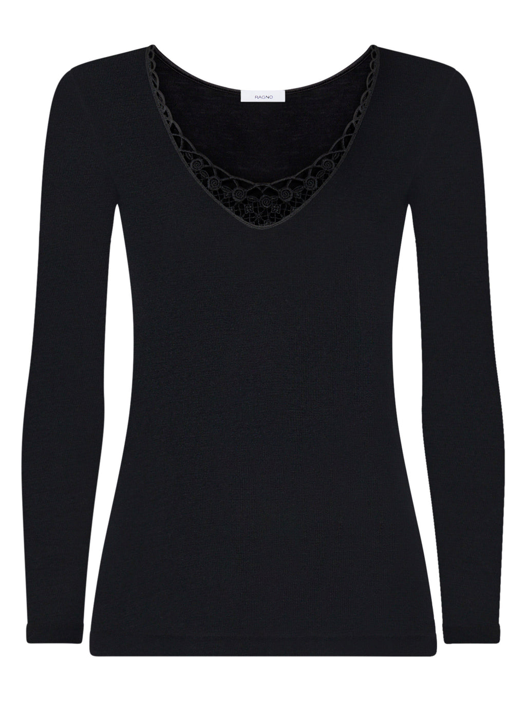 Maglietta girocollo a manica lunga in preziosa maglia unita di lana e seta caratterizzata dal bordo della scollatura in pizzo macramè.