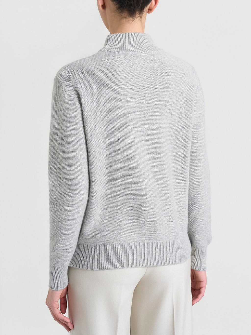 La vestibilità regular accompagna con equilibrio le forme, mentre le maniche lisce, completate da polsini funzionali, riprendono la finitura del collo e del fondo, garantendo comodità ed eleganza.