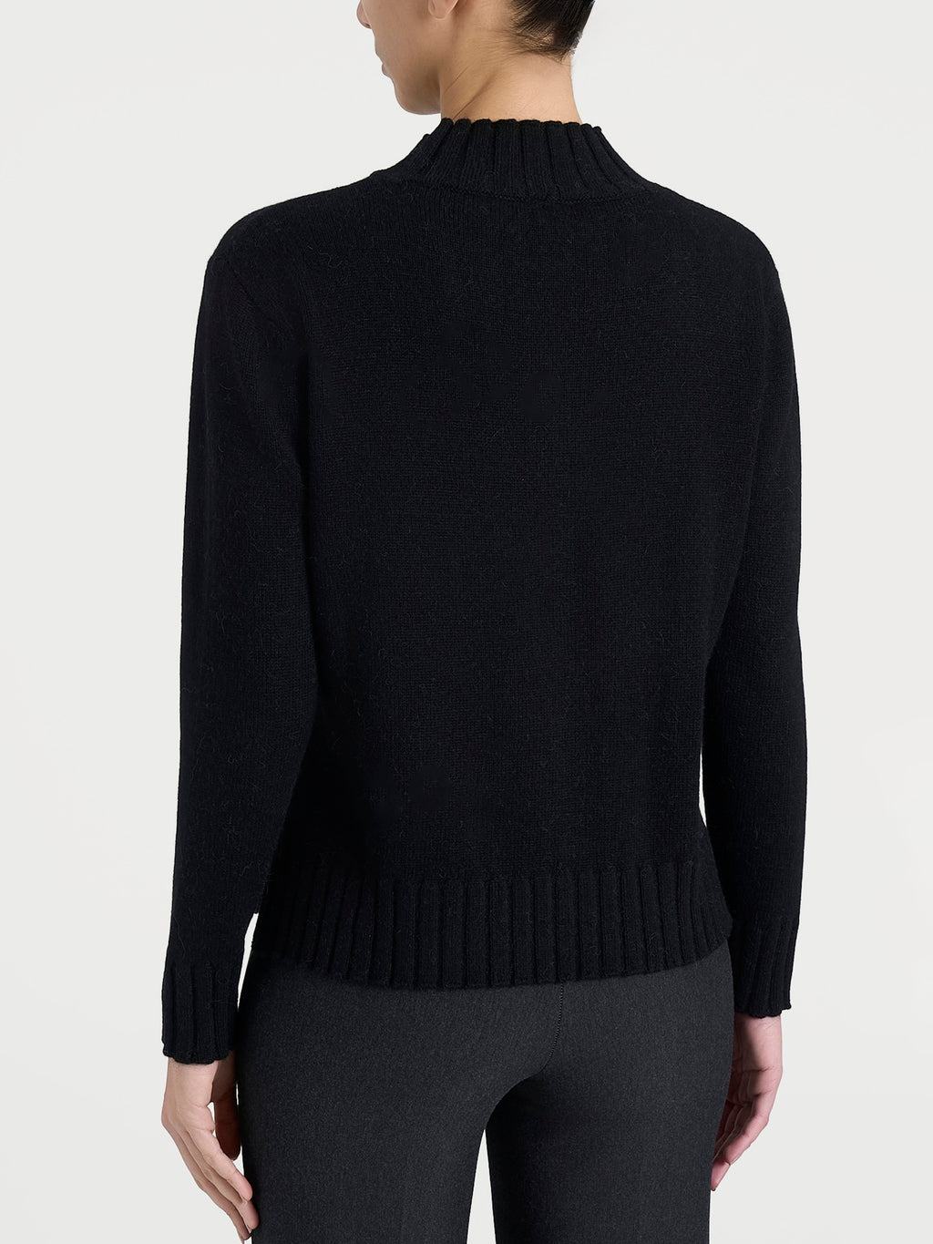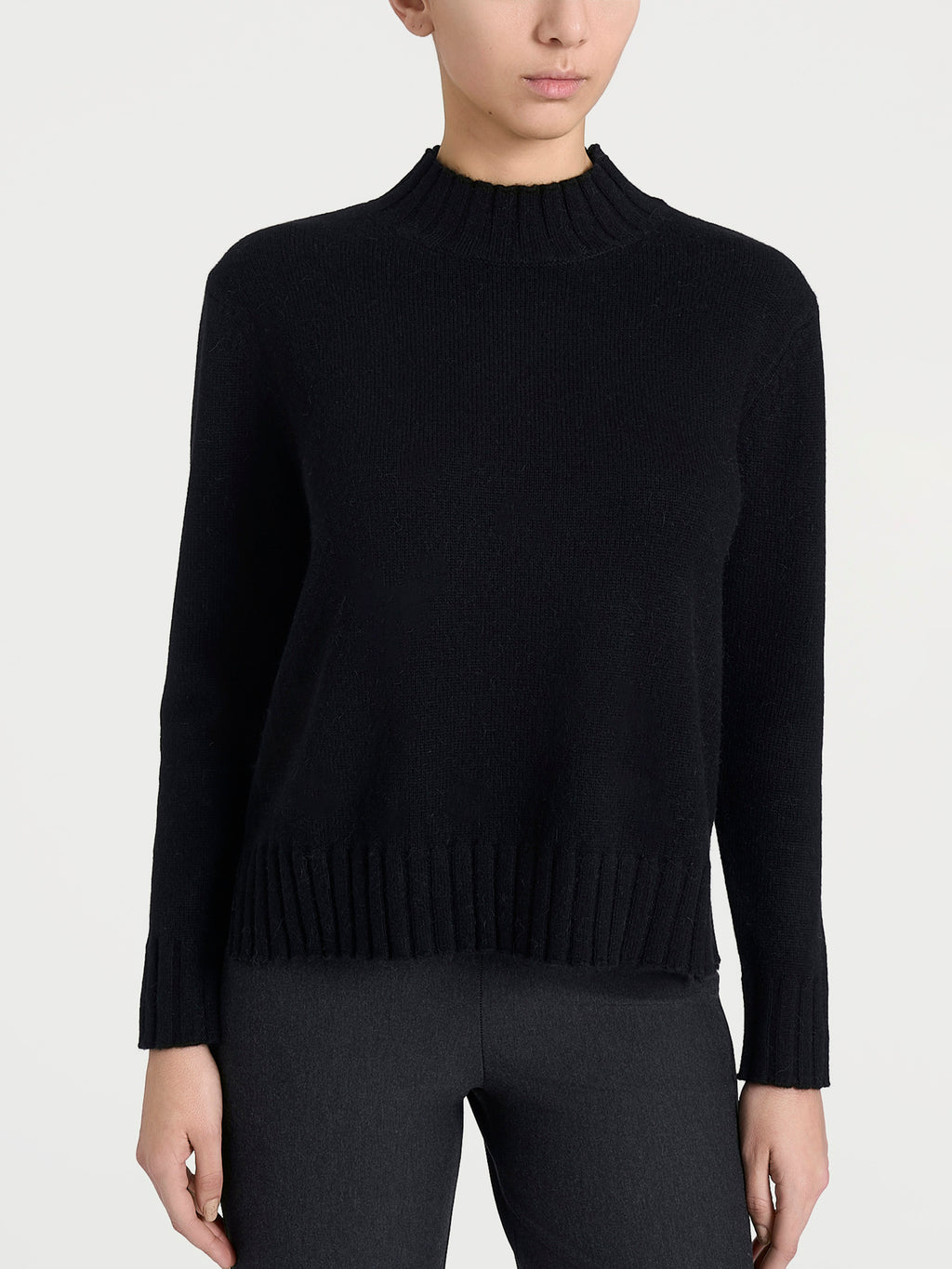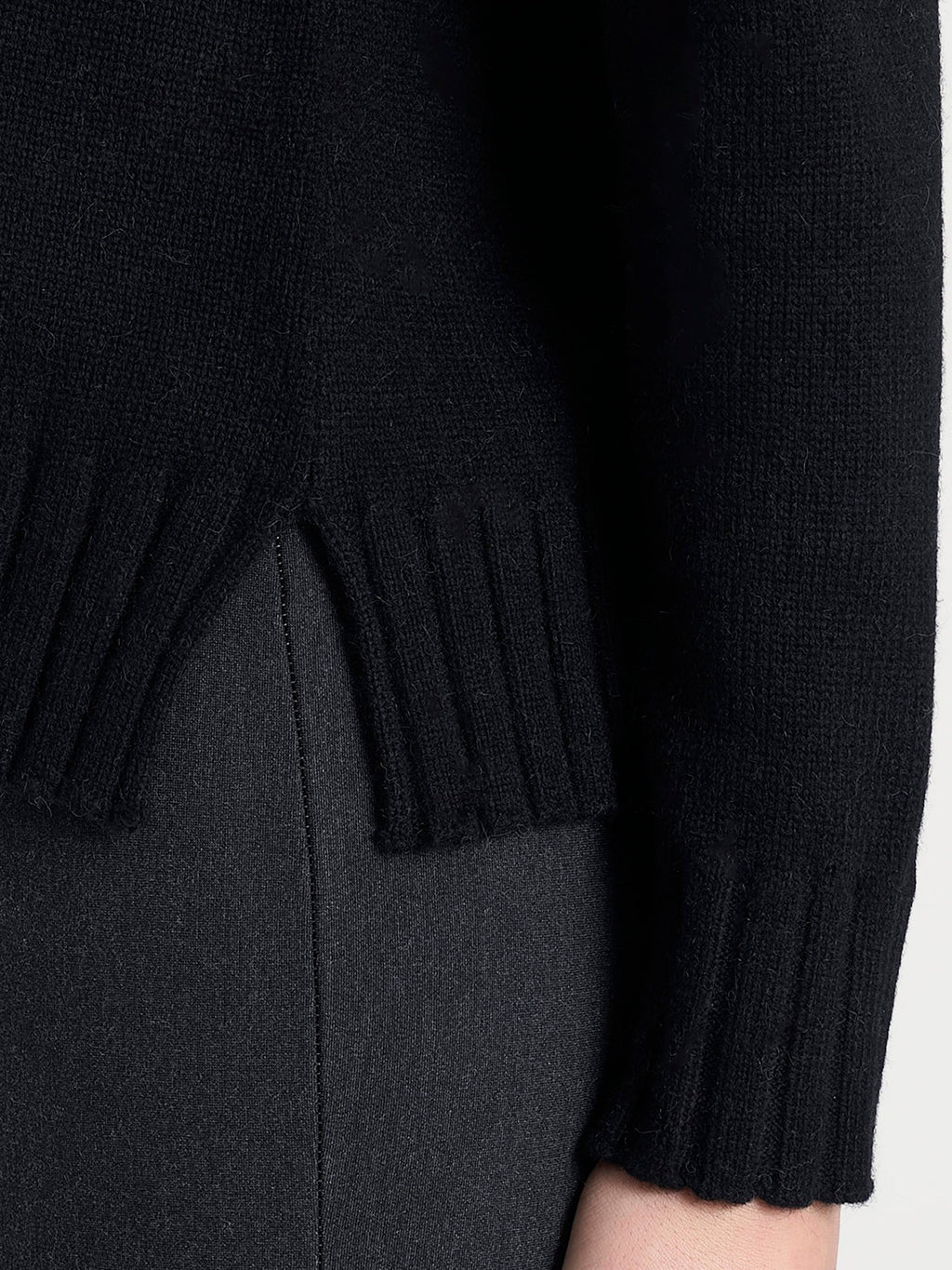 Gli spacchetti laterali aggiungono un dettaglio di stile, mentre la bordatura a costina 1x1 definisce con eleganza i contorni del capo.