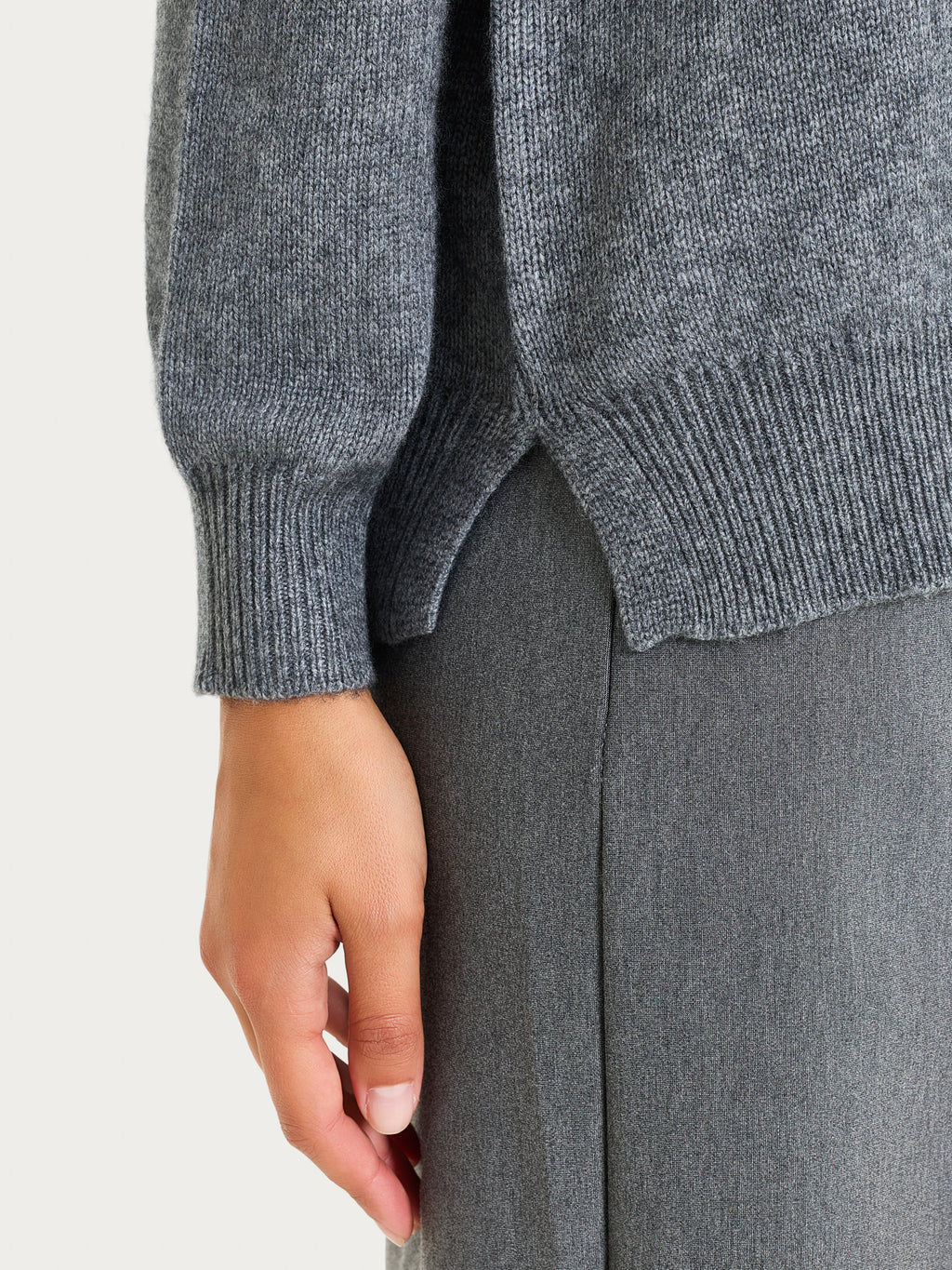 Gli spacchetti laterali aggiungono un dettaglio di stile, mentre la bordatura a costina 1x1 definisce con eleganza i contorni del capo.