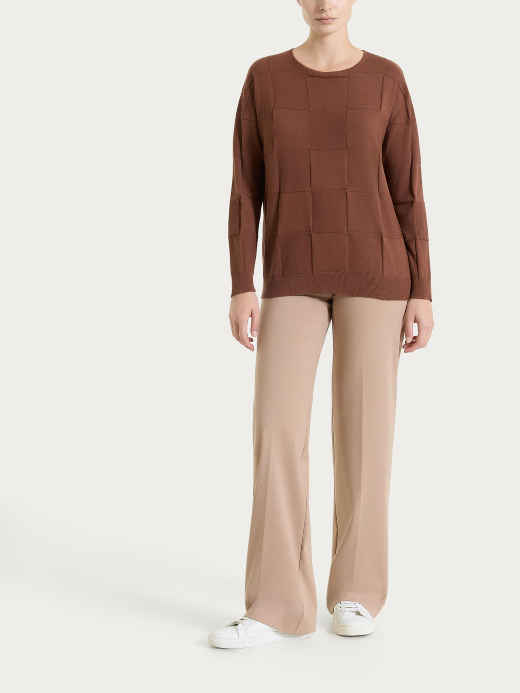 Il tratto distintivo è la fantasia check a quadro tono su tono, lavorata direttamente nella trama: un disegno discreto ma ricercato, che crea un elegante effetto materico e aggiunge profondità al capo senza appesantirne lo stile.