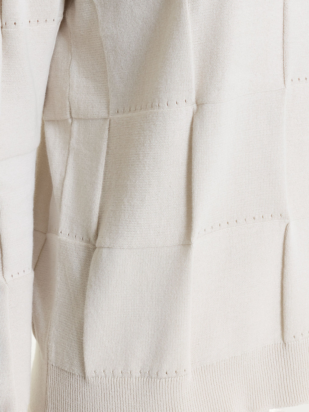 Il tratto distintivo è la fantasia check a quadro tono su tono, lavorata direttamente nella trama: un disegno discreto ma ricercato, che crea un elegante effetto materico e aggiunge profondità al capo senza appesantirne lo stile.